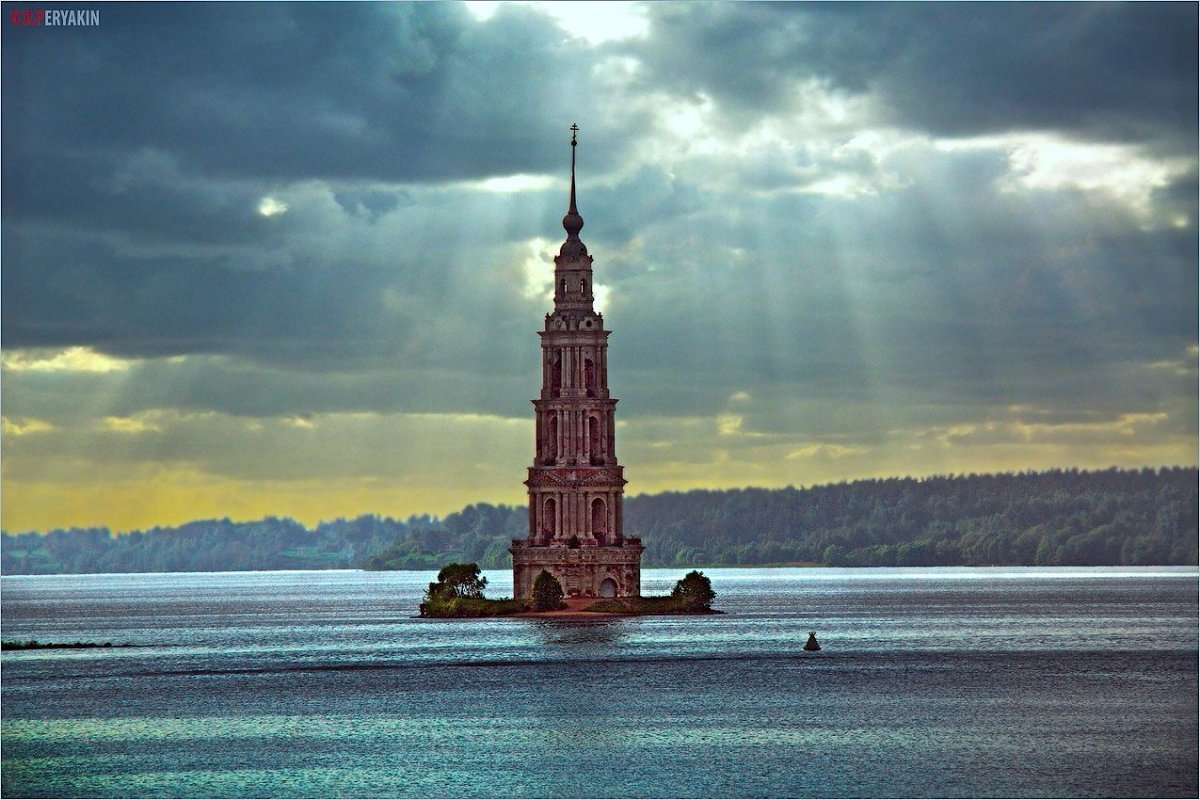 На повороте реки мы видим знаменитую затопленную колокольню - колокольня Николаевского собора. Она возвышается над водой на искусственном острове с причалом для лодок и, с момента затопления старого Калязина при строительстве Угличского водохранилища, является еще и маяком, так как в этом месте Волга делает резкий поворот. В недавнем времени колокольню отреставрировали и возле неё проводятся молебны. На нее вновь установили 5 колоколов, отлитых по спецзаказу в московской мастерской, и теперь каждое богослужение сопровождается колокольным звоном. А сам Николаевский собор был разобран и перенесён. Осталась на месте только колокольня, которая радует нас своей красотой и по сей день.
