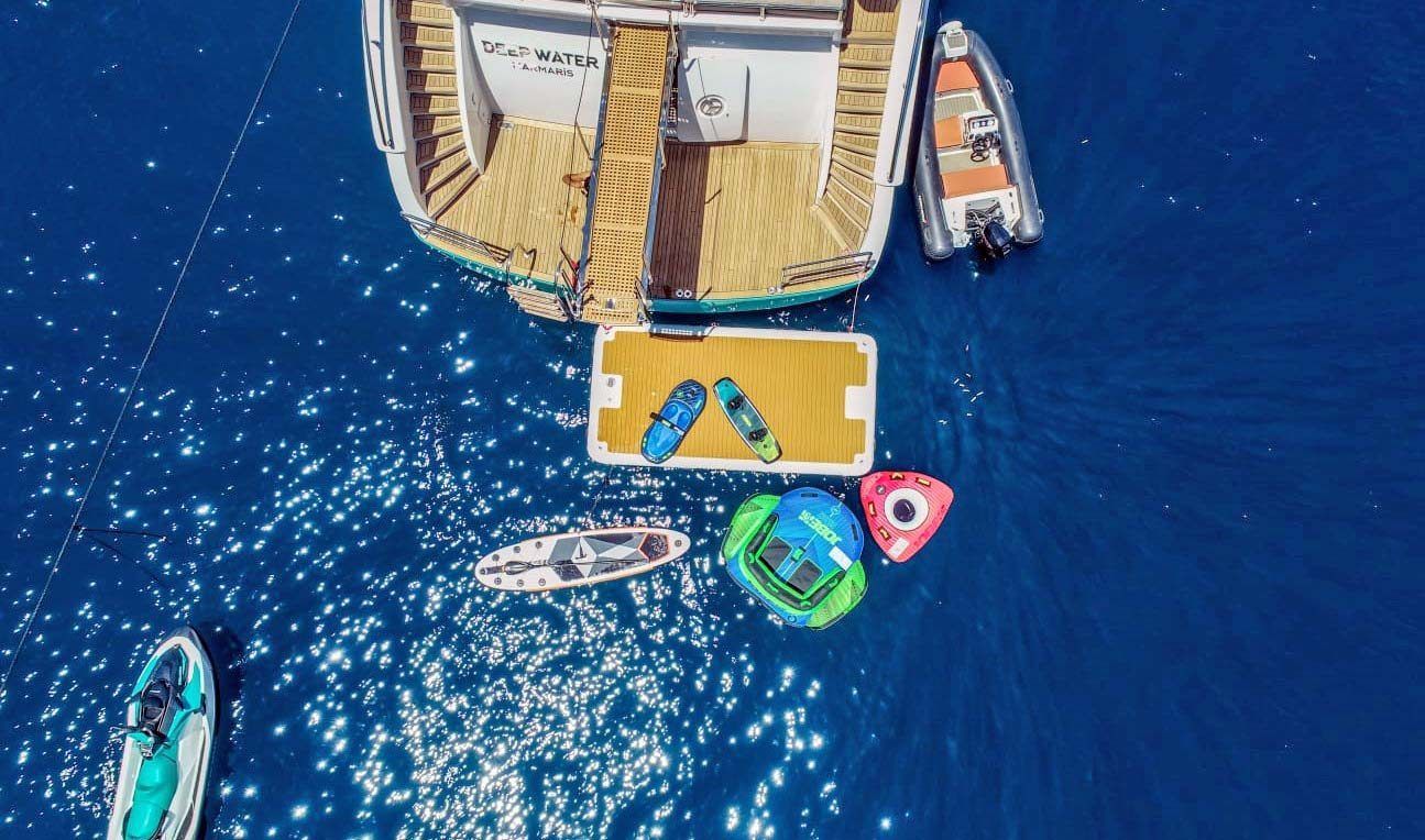 Deep Water предлагает хороший выбор водных игрушек и аксессуаров, которые развлекут вас во время круиза. Отправьтесь в море на гидроциклах, прокатитесь на водных лыжах или вейкборде, которые доставят массу удовольствия независимо от того, новичок вы или опытный профессионал. Кроме этого, в гараже Deep Water также есть каноэ, рыболовное снаряжение, доски для серфинга на коленях (Kneeboard), доски для классического серфинга и снаряжение для подводного плавания. Для комфортного исследования островов, заливов и пещер на борту Deep Water есть два тендера. Кормовой кринолин яхты легко превращается в платформу для купания и развлечений.