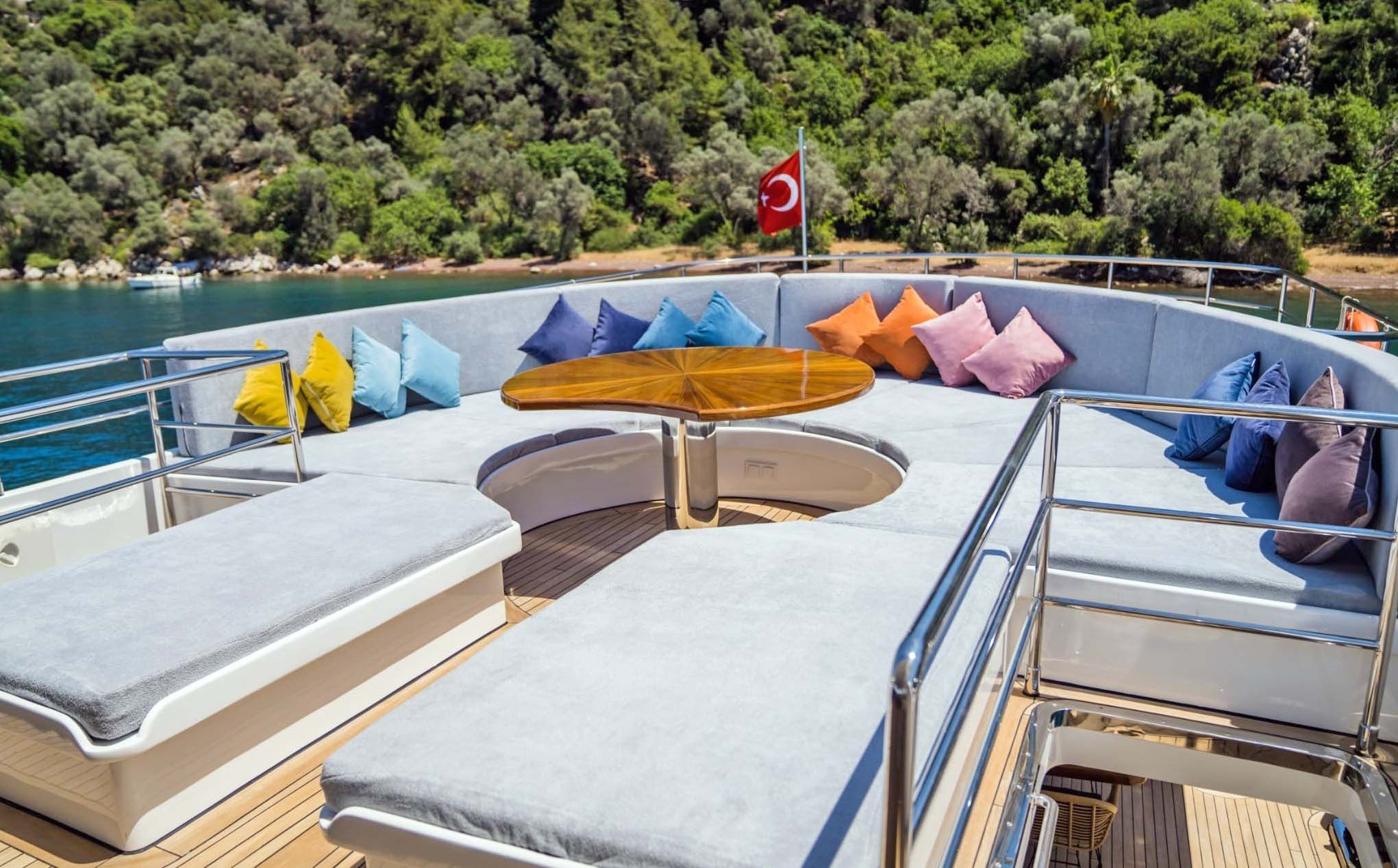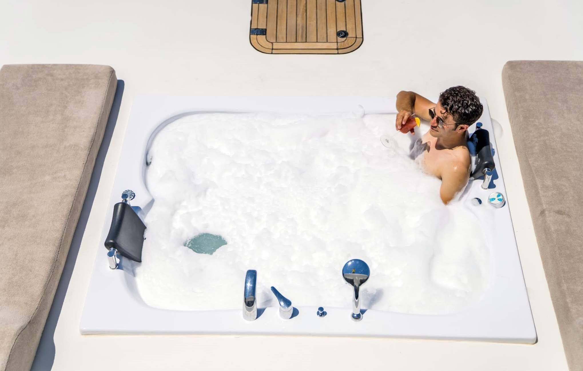 Во время круиза на борту яхты вы найдете множество занятий и развлечений, в частности, джакузи на палубе, идеально подходящее для того, чтобы наслаждаться пейзажем с любимым напитком в руке.