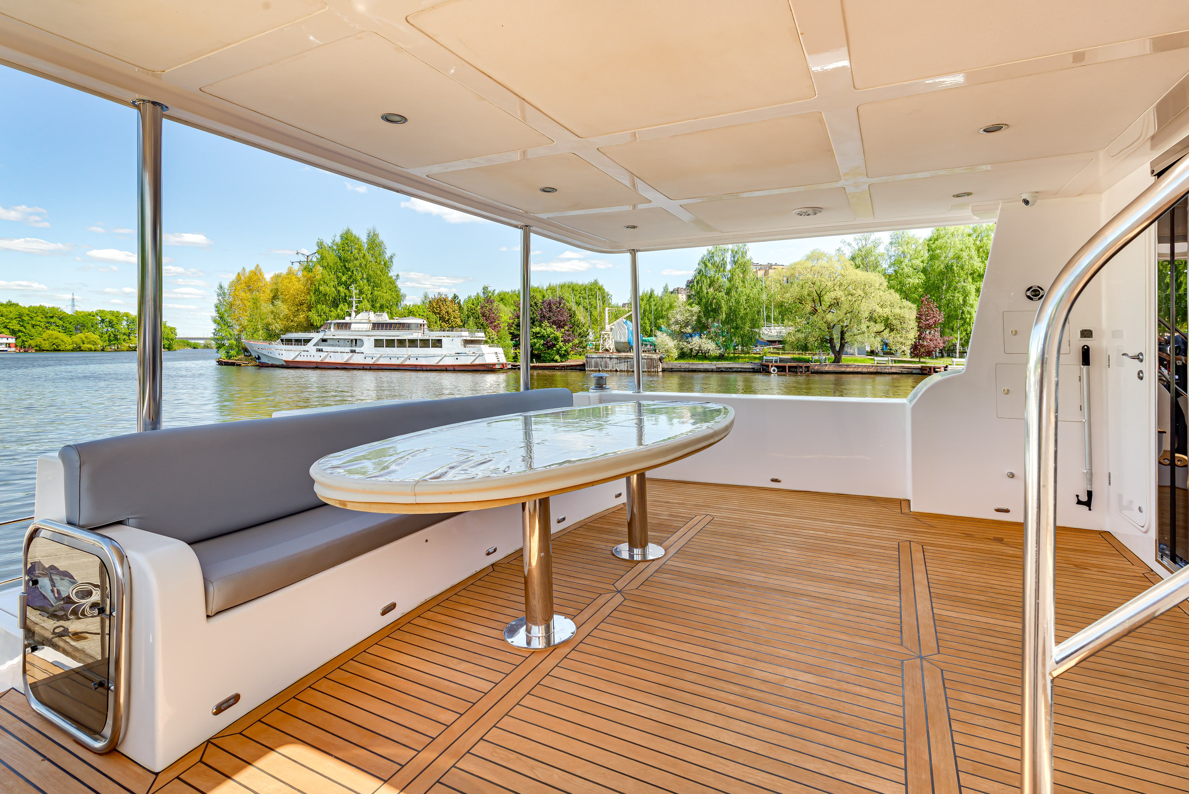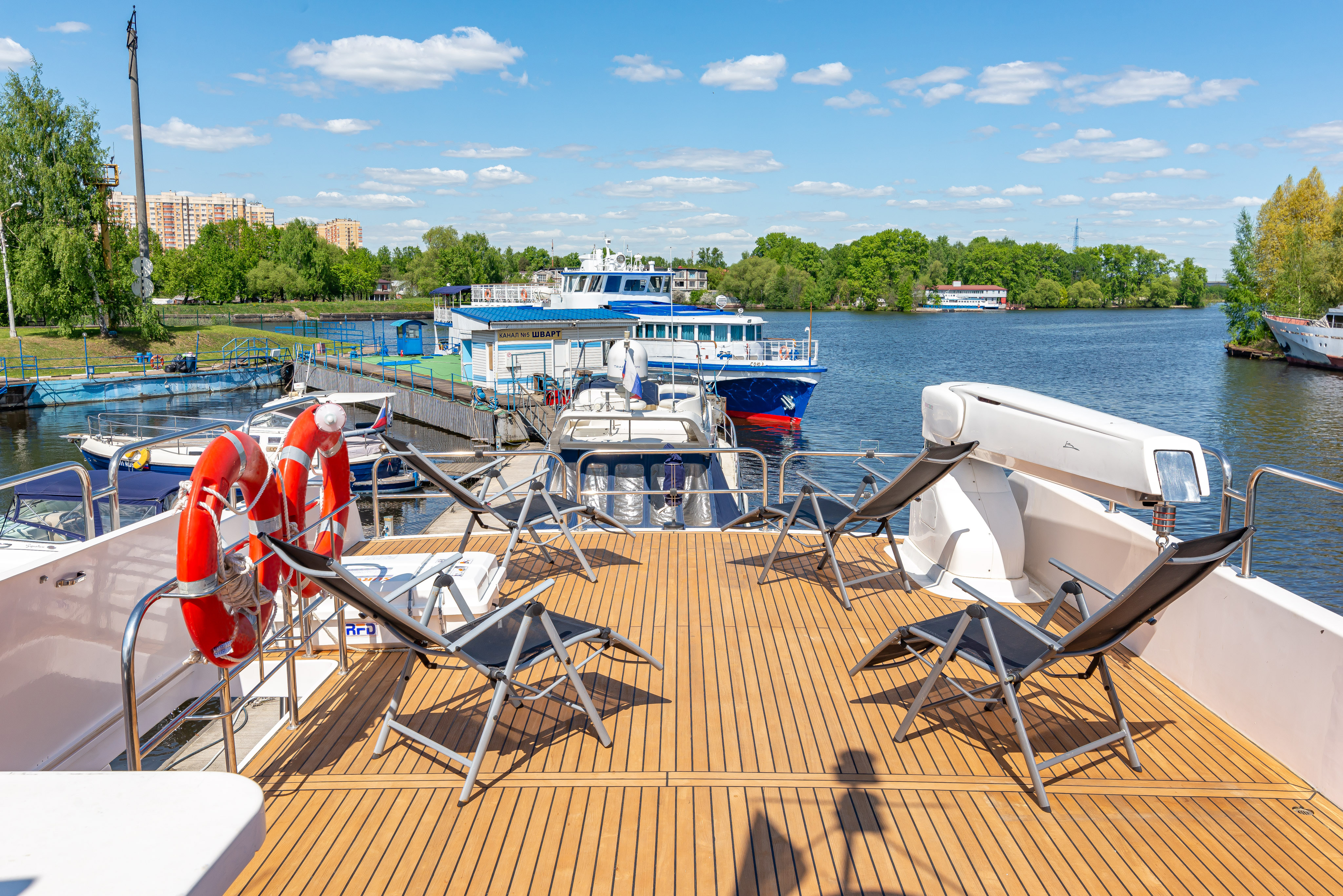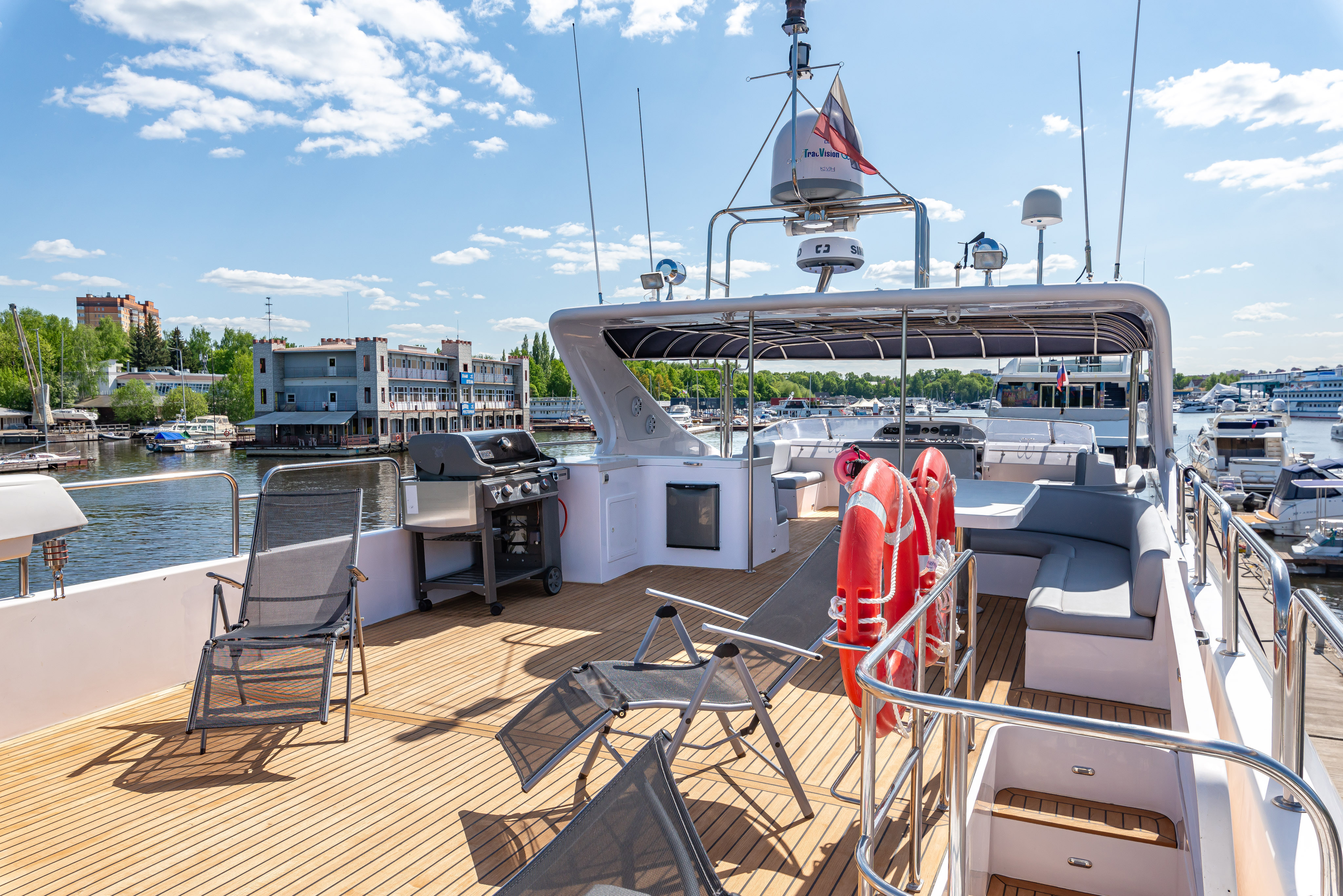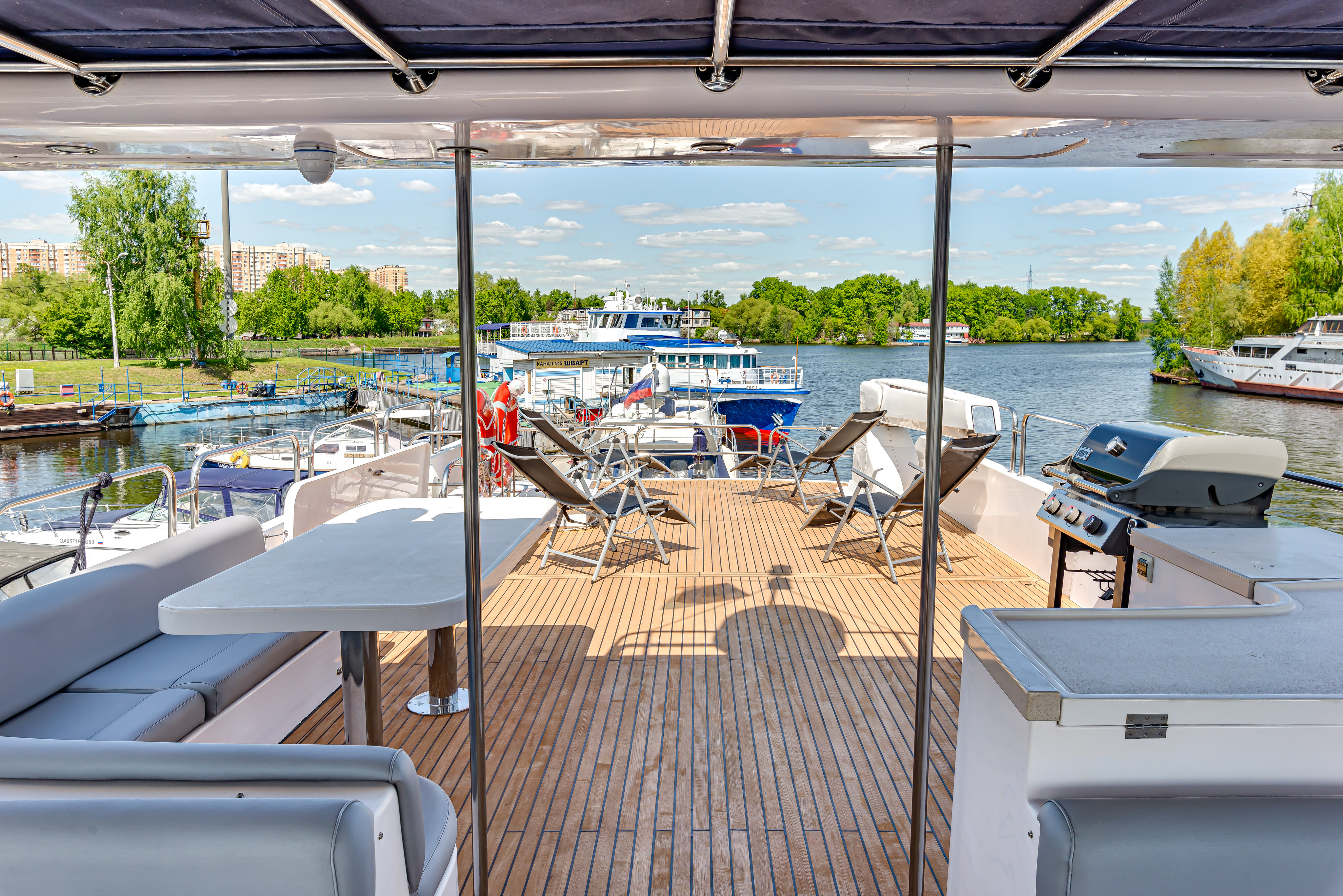 Простор на верхней палубе (флайбридже) с зоной отдыха и барбекю как будто специально создан для вечеринок во время дневных прогулок по Подмосковью или отдыха во время круиза по Волге.