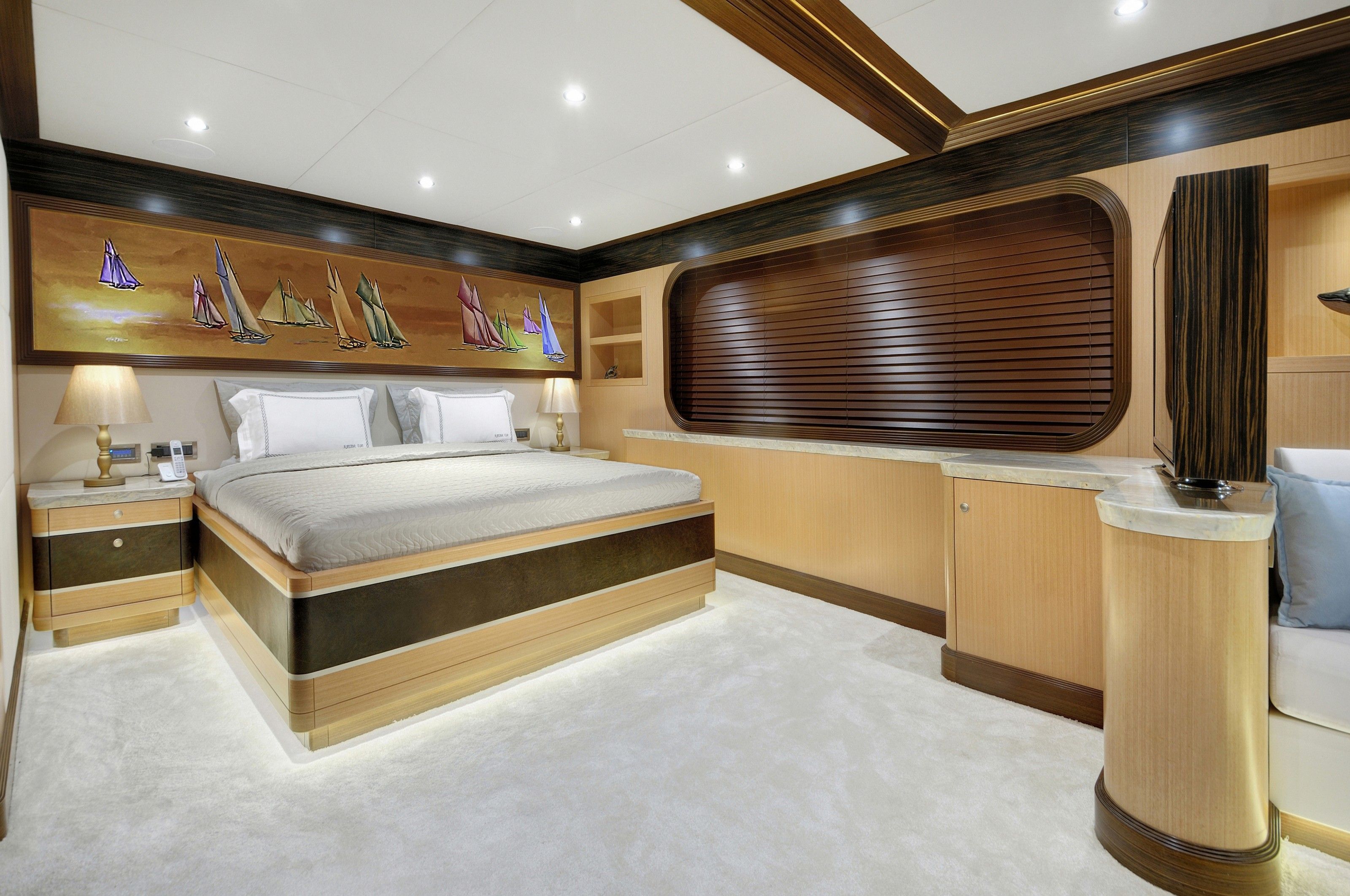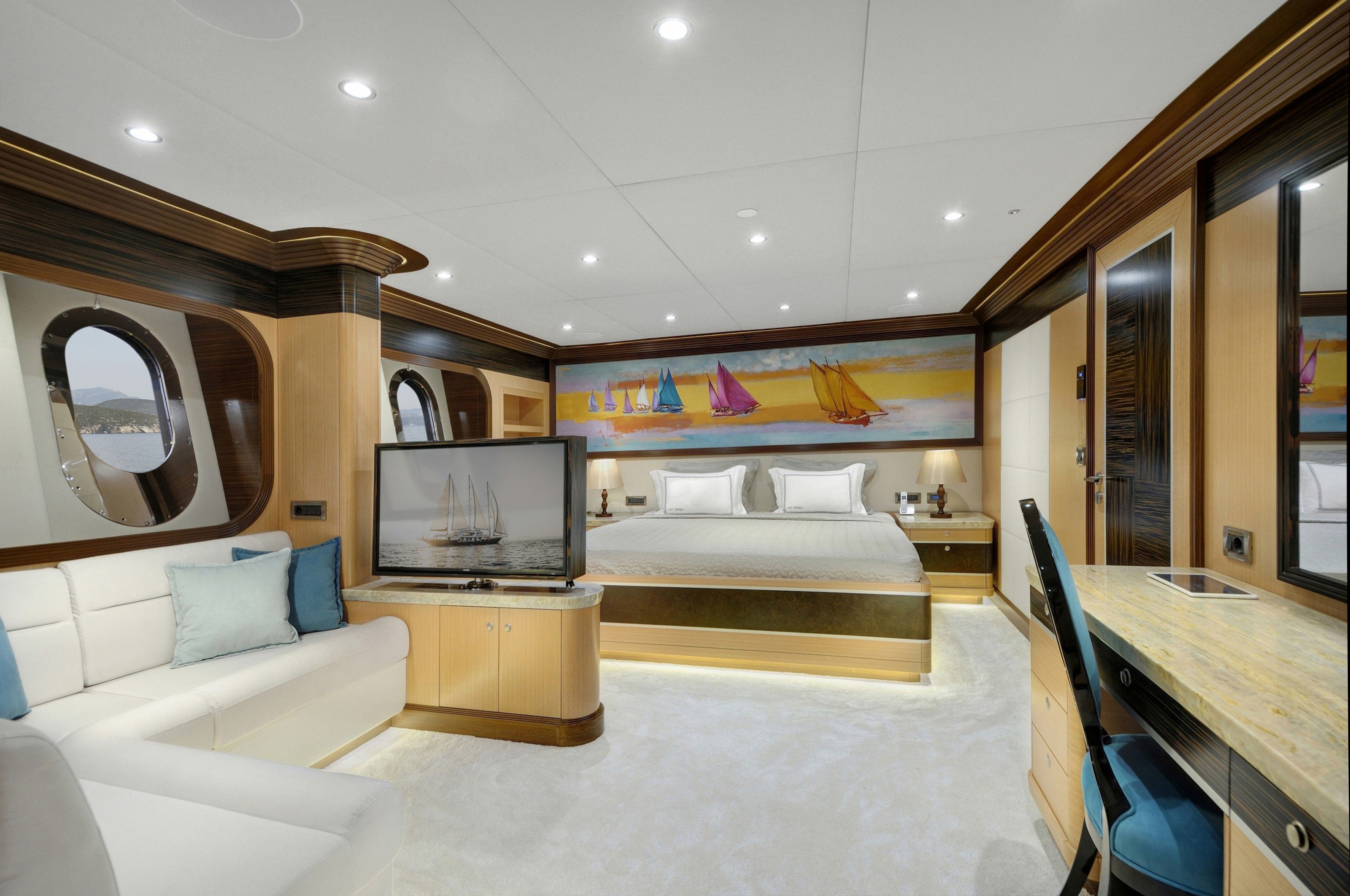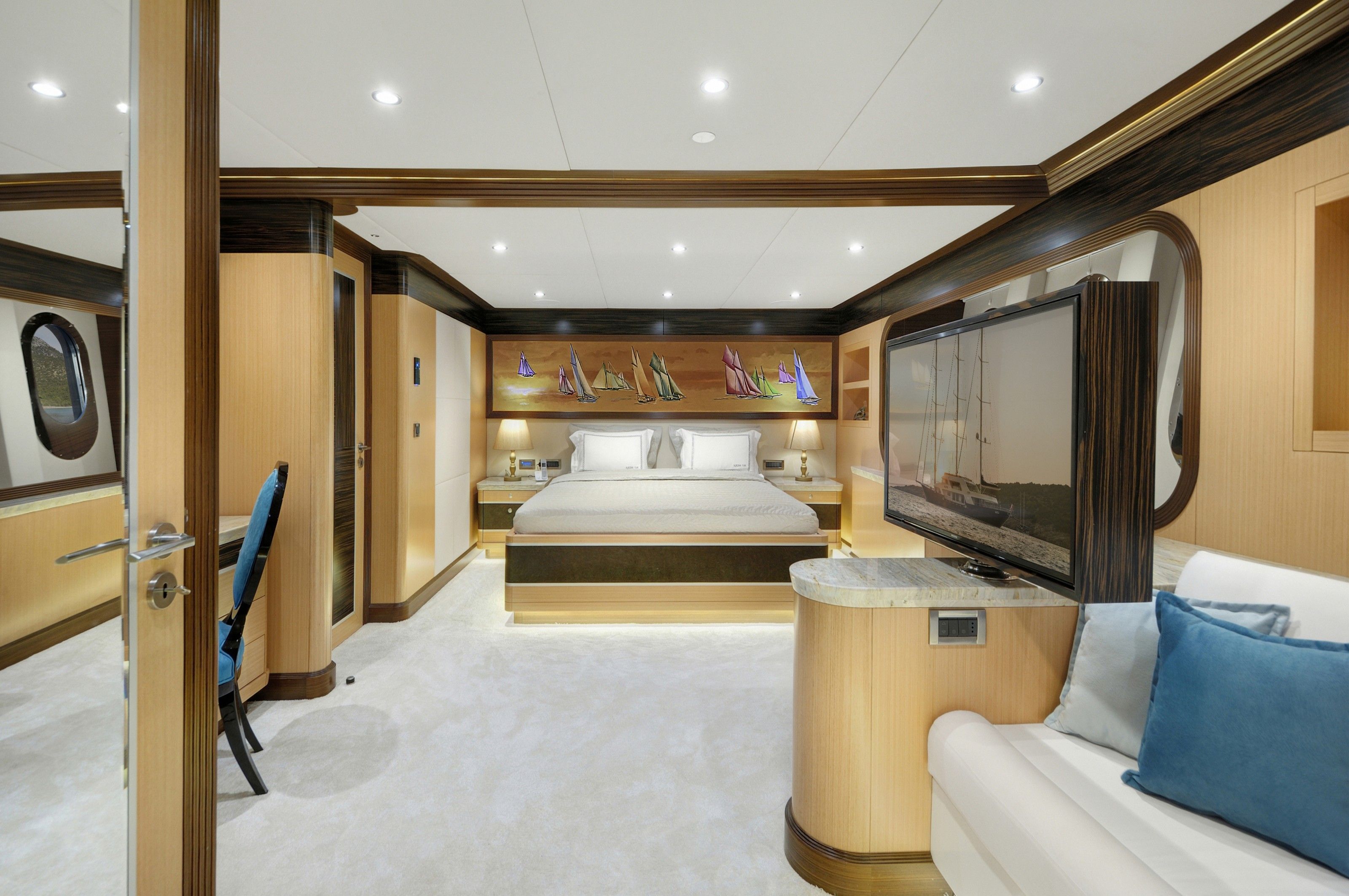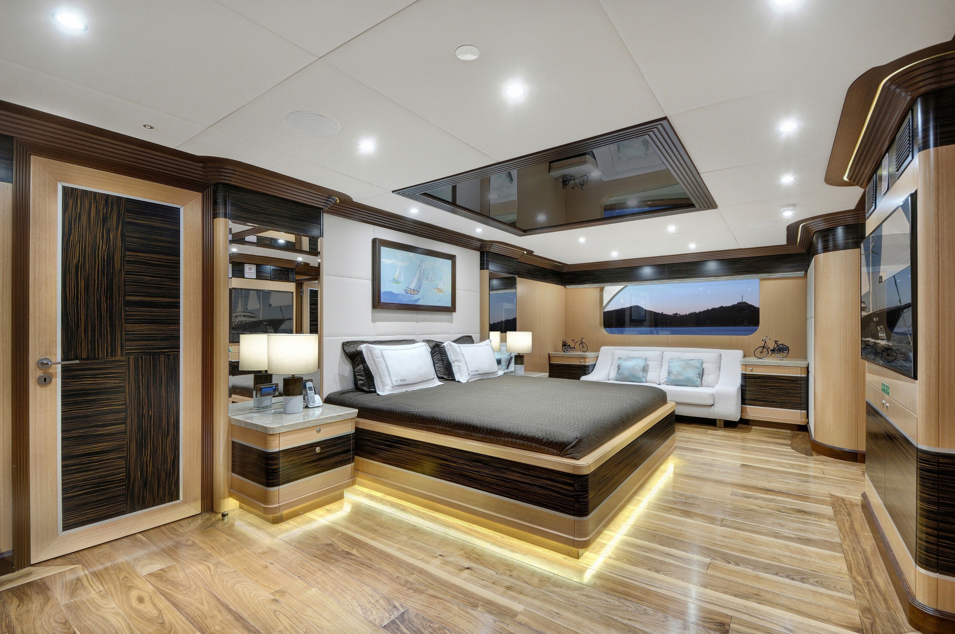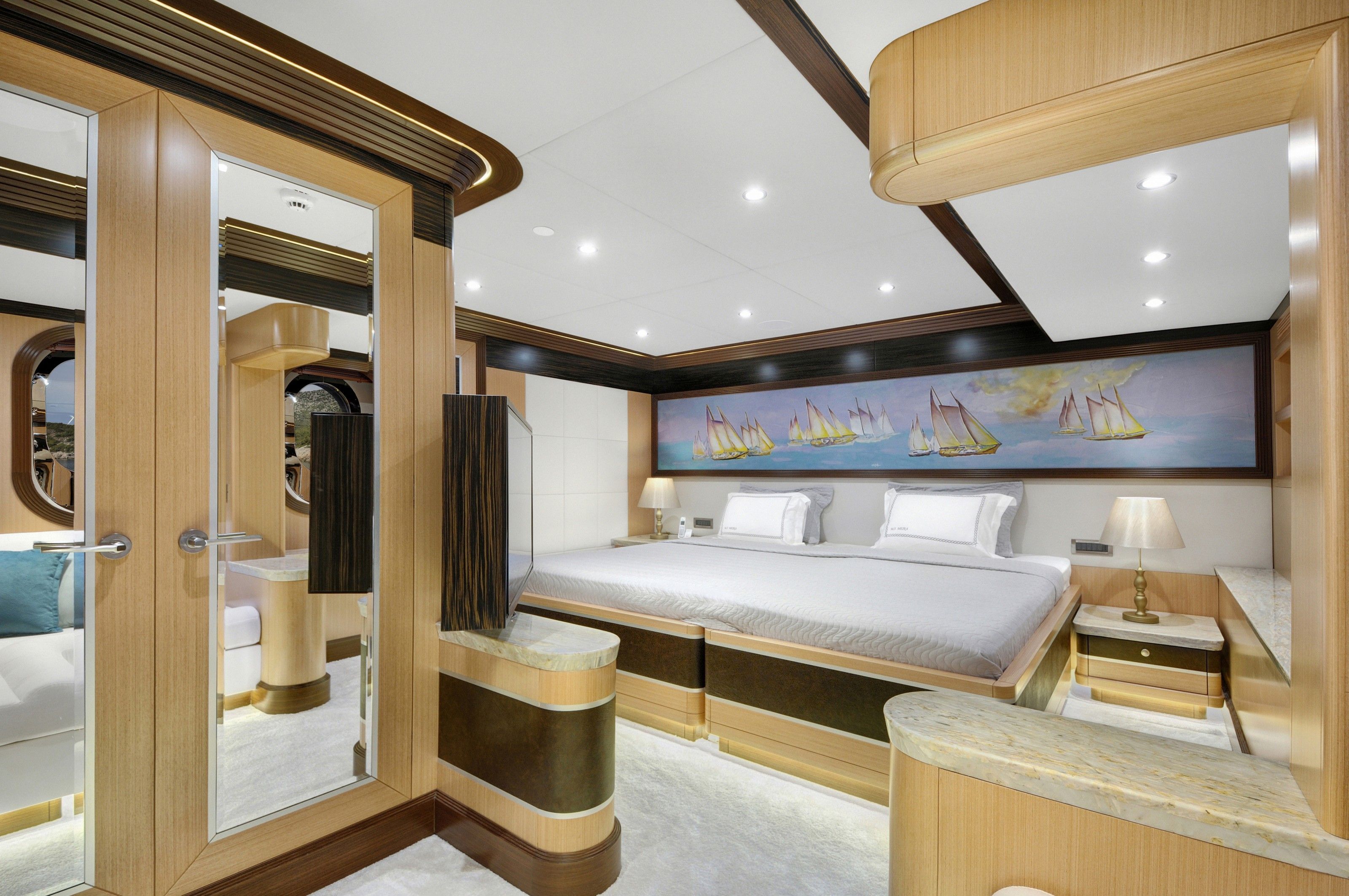 На основной палубе расположена просторная мастер-каюта с кроватью king-size с двумя санузлами и двумя гардеробными. На нижней палубе расположены 3 каюты с двуспальными кроватями и 2 каюты по 2 односпальные кровати в каждой. Все каюты оборудованы собственными санузлами.