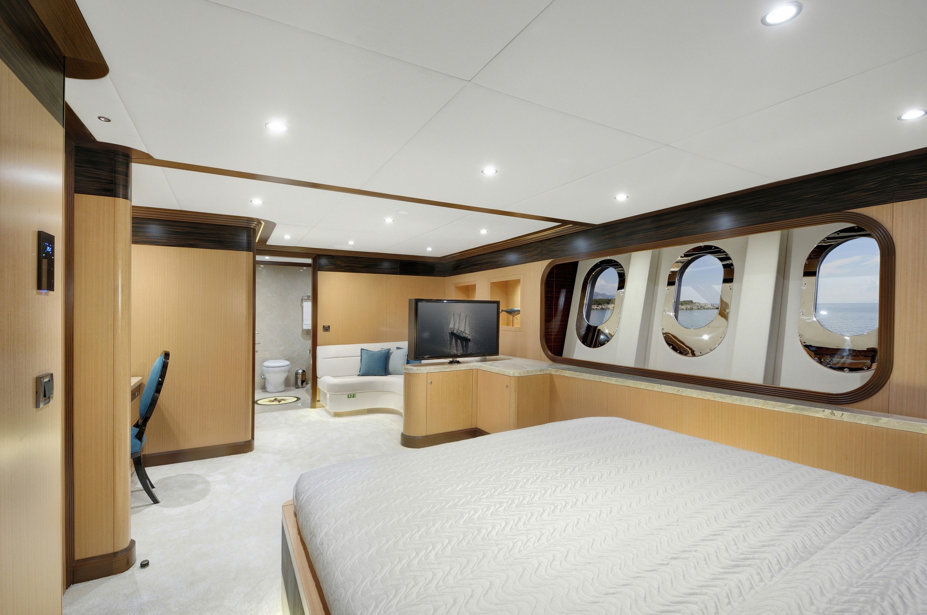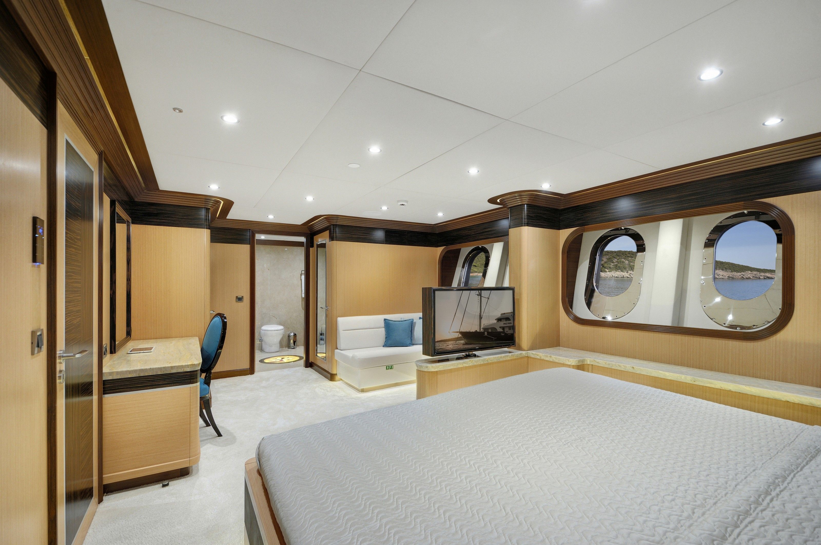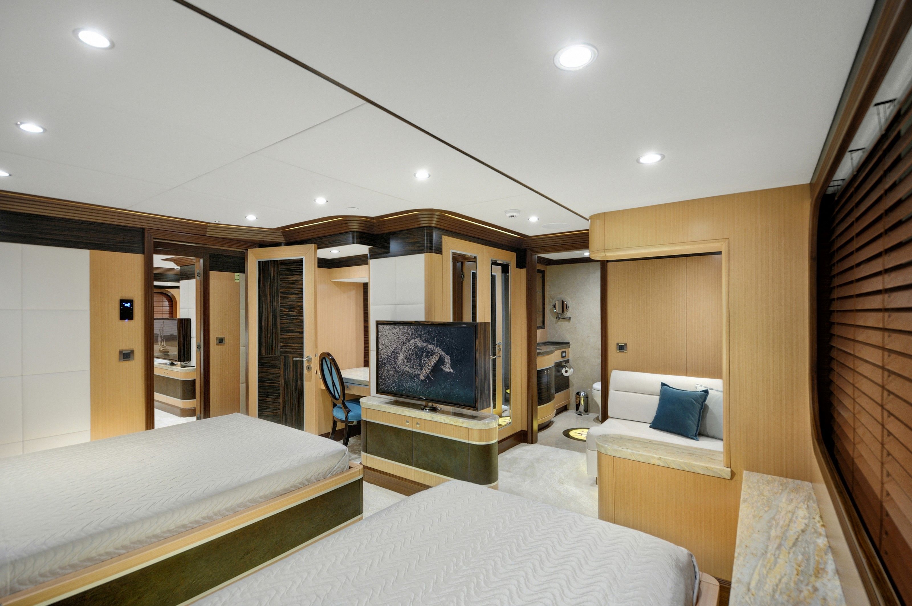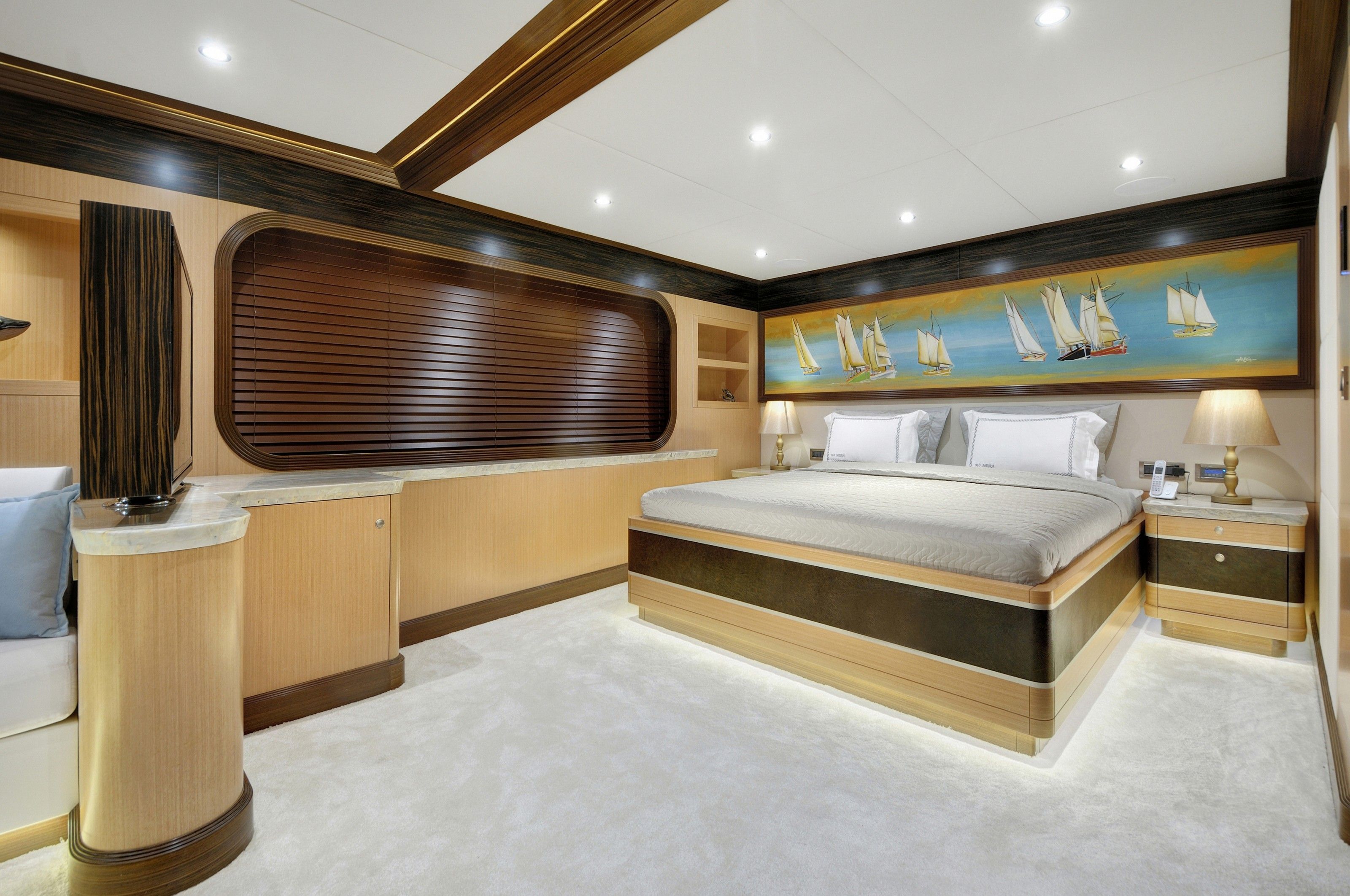 На основной палубе расположена просторная мастер-каюта с кроватью king-size с двумя санузлами и двумя гардеробными. На нижней палубе расположены 3 каюты с двуспальными кроватями и 2 каюты по 2 односпальные кровати в каждой. Все каюты оборудованы собственными санузлами.