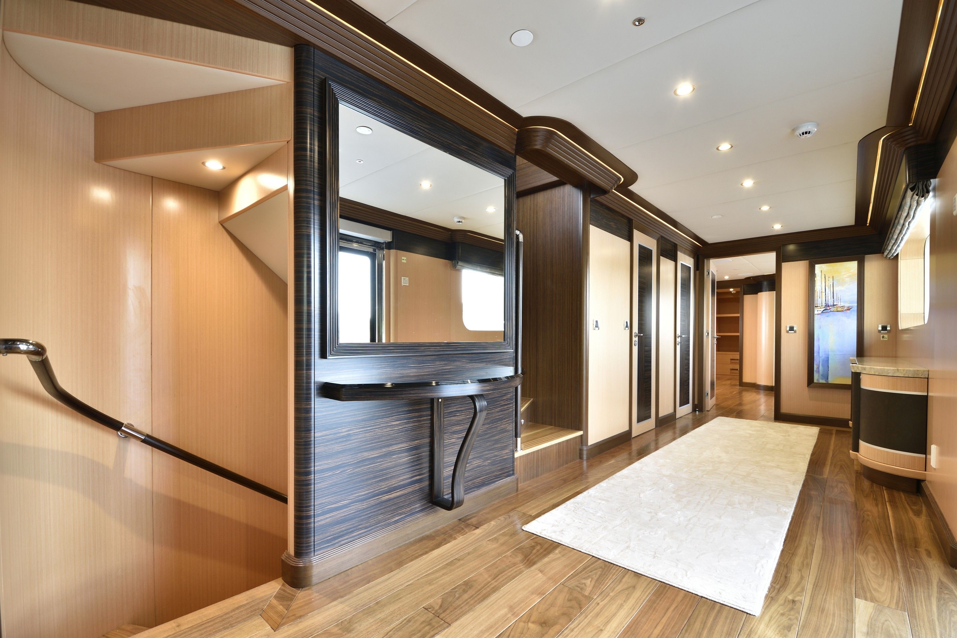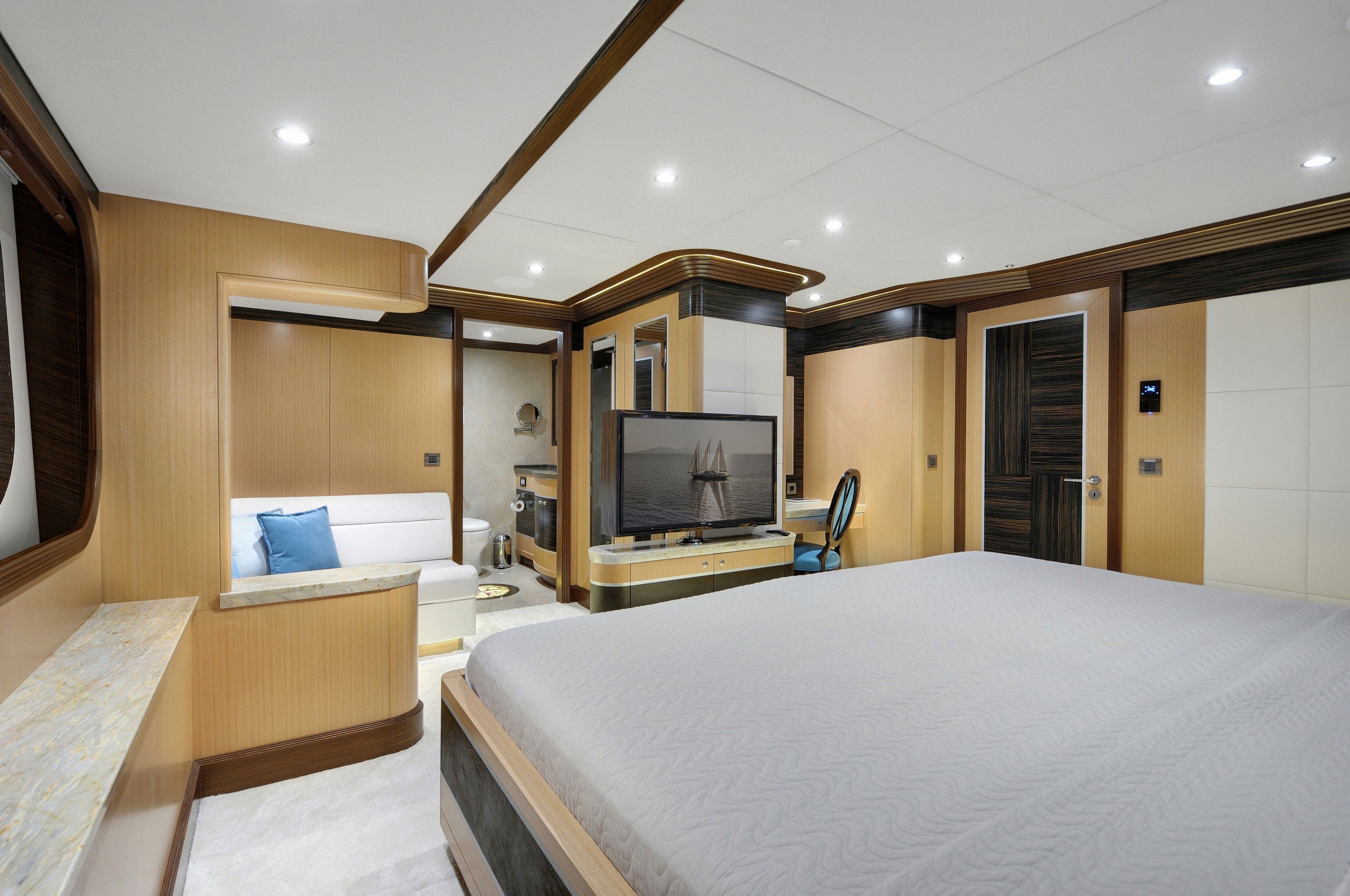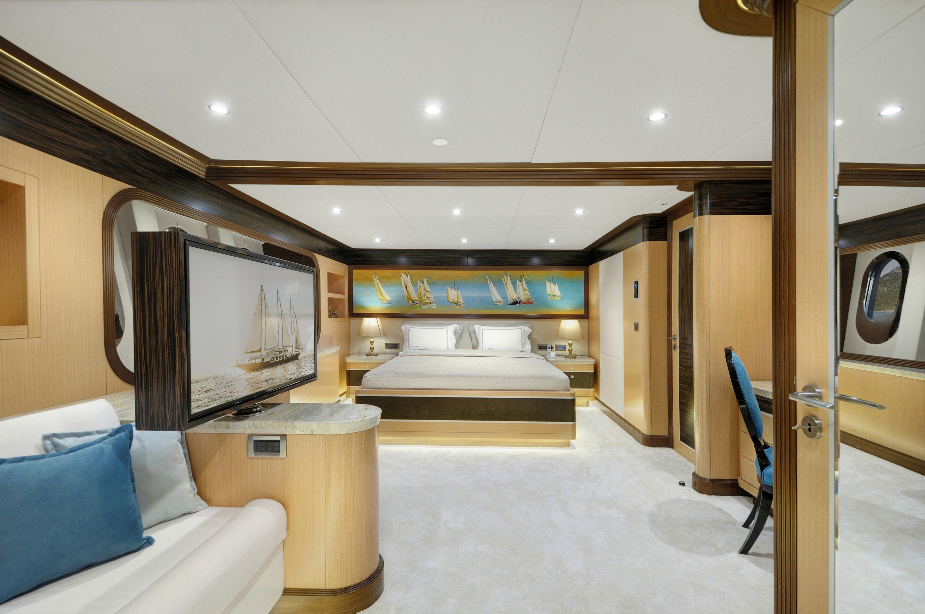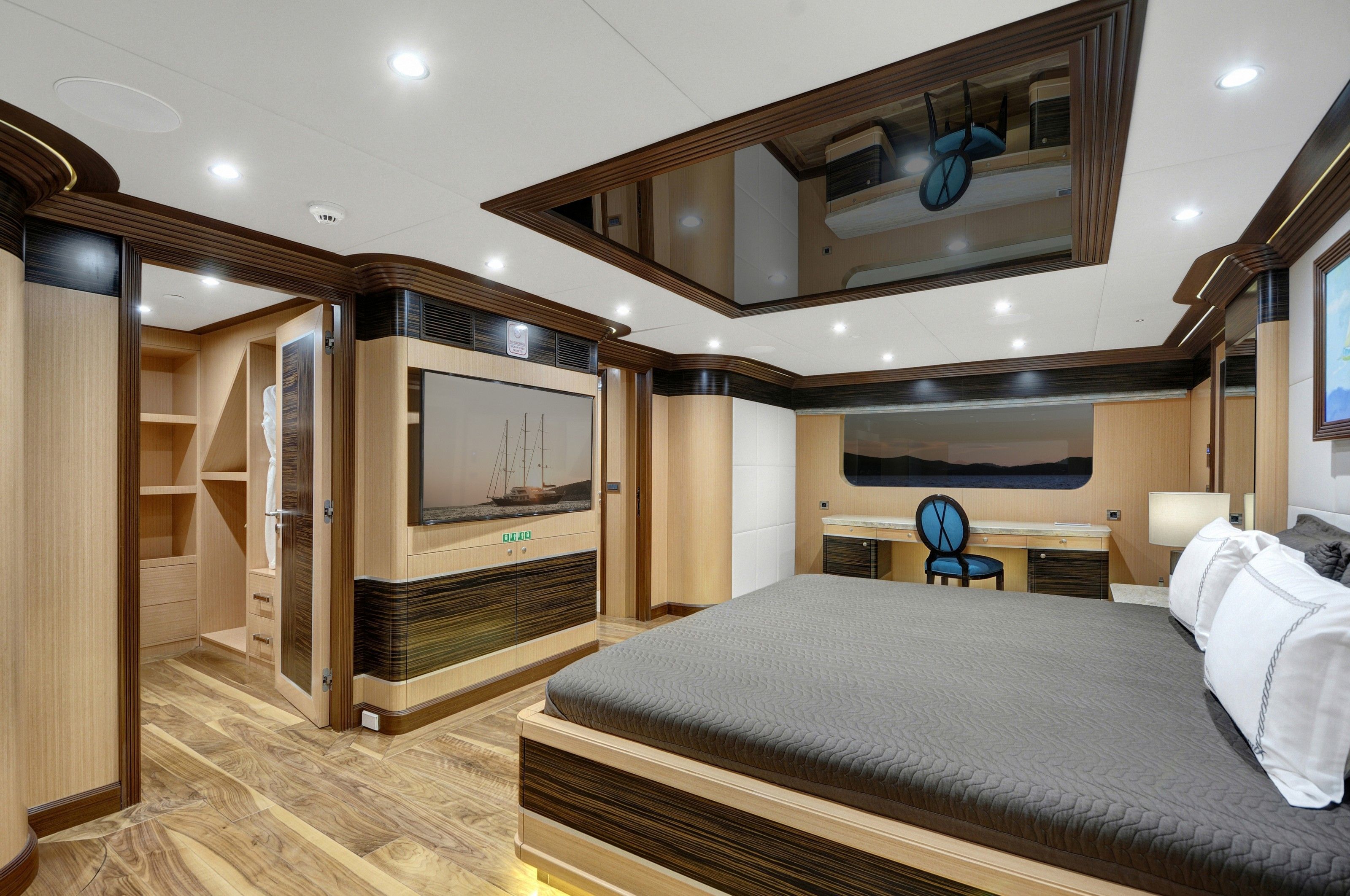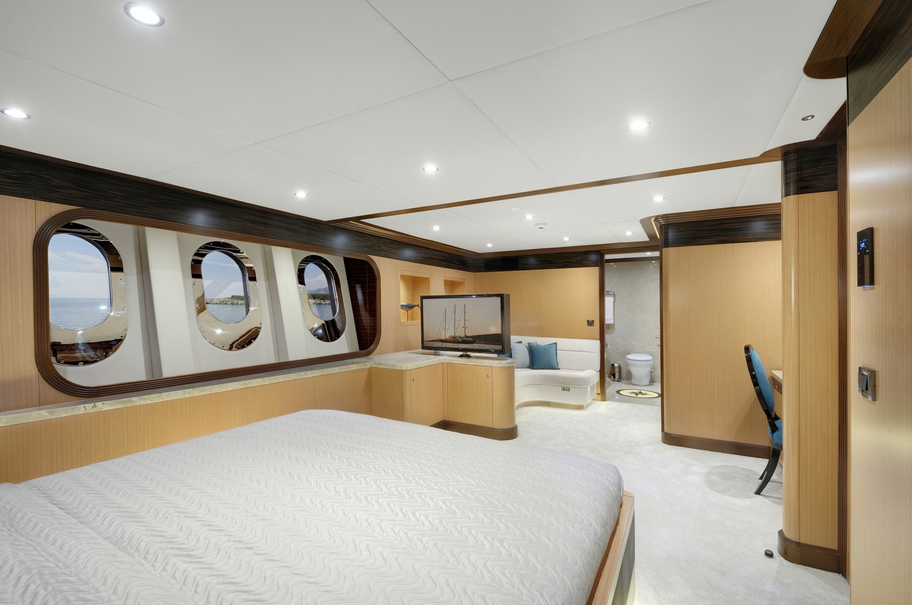 На основной палубе расположена просторная мастер-каюта с кроватью king-size с двумя санузлами и двумя гардеробными. На нижней палубе расположены 3 каюты с двуспальными кроватями и 2 каюты по 2 односпальные кровати в каждой. Все каюты оборудованы собственными санузлами.