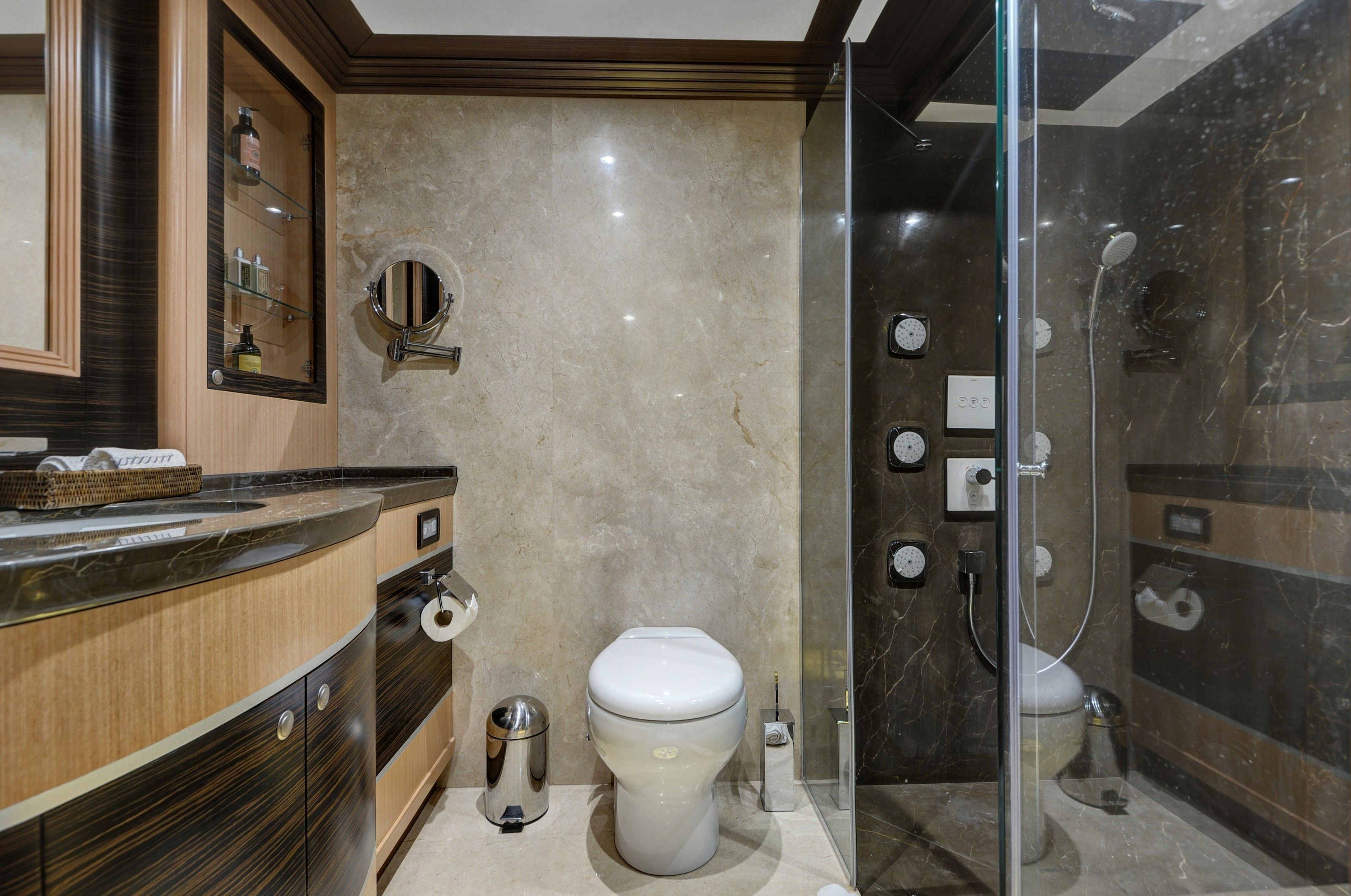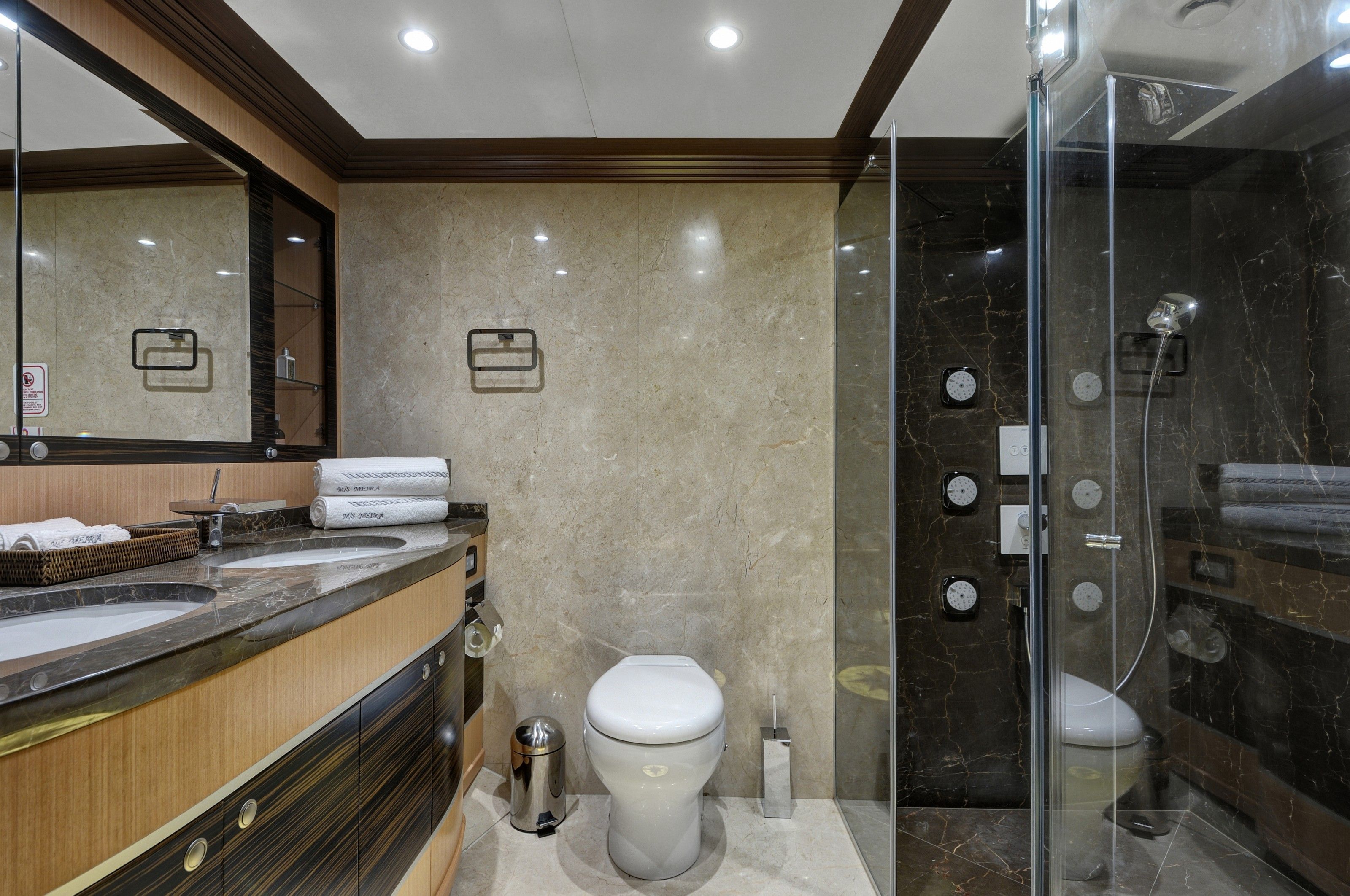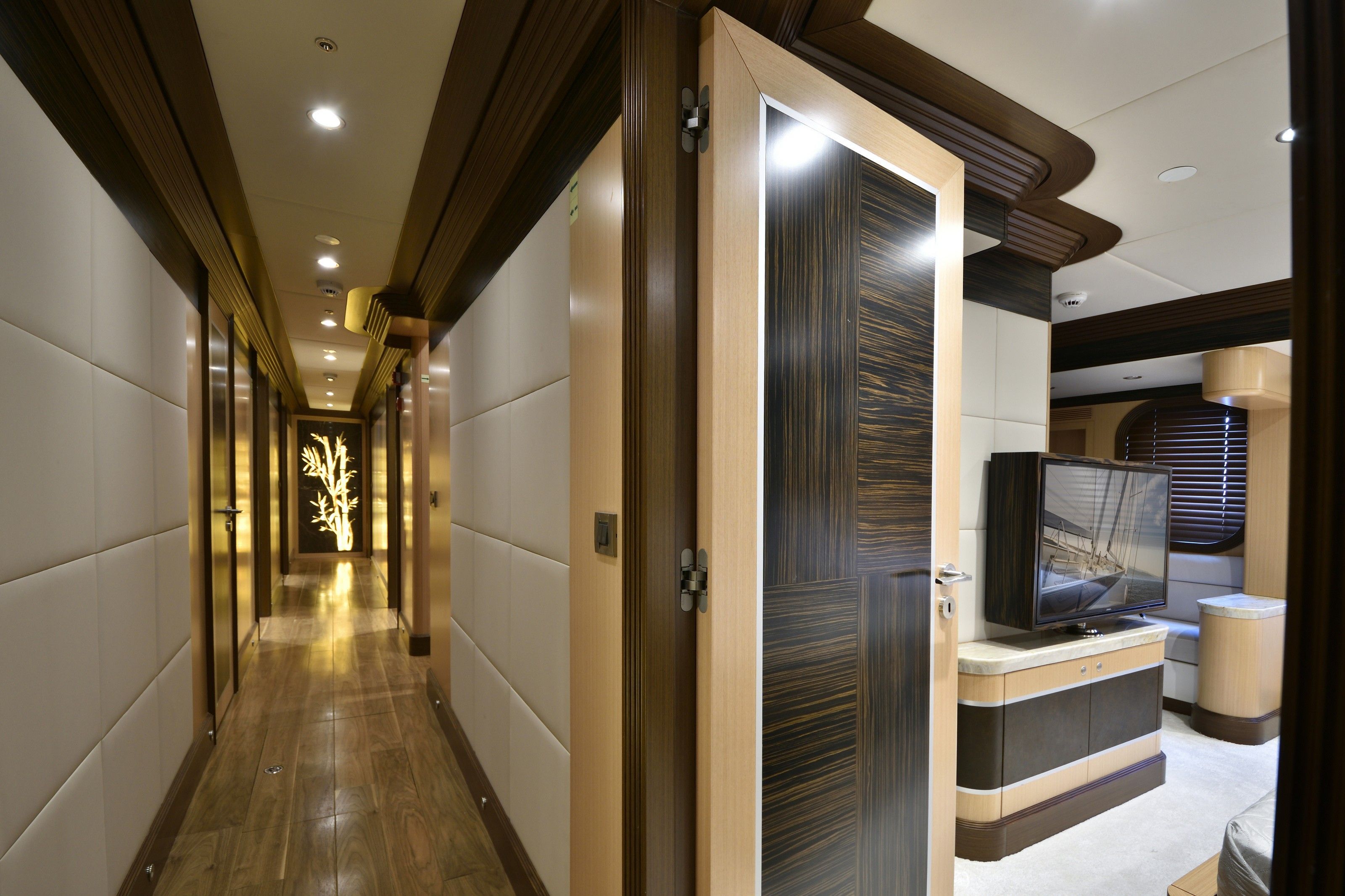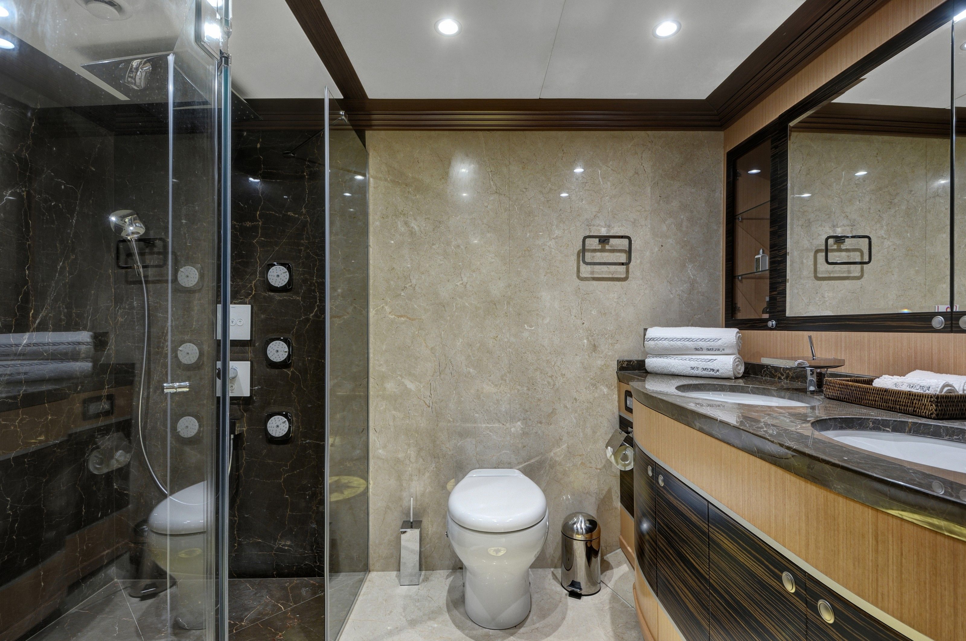 На основной палубе расположена просторная мастер-каюта с кроватью king-size с двумя санузлами и двумя гардеробными. На нижней палубе расположены 3 каюты с двуспальными кроватями и 2 каюты по 2 односпальные кровати в каждой. Все каюты оборудованы собственными санузлами.