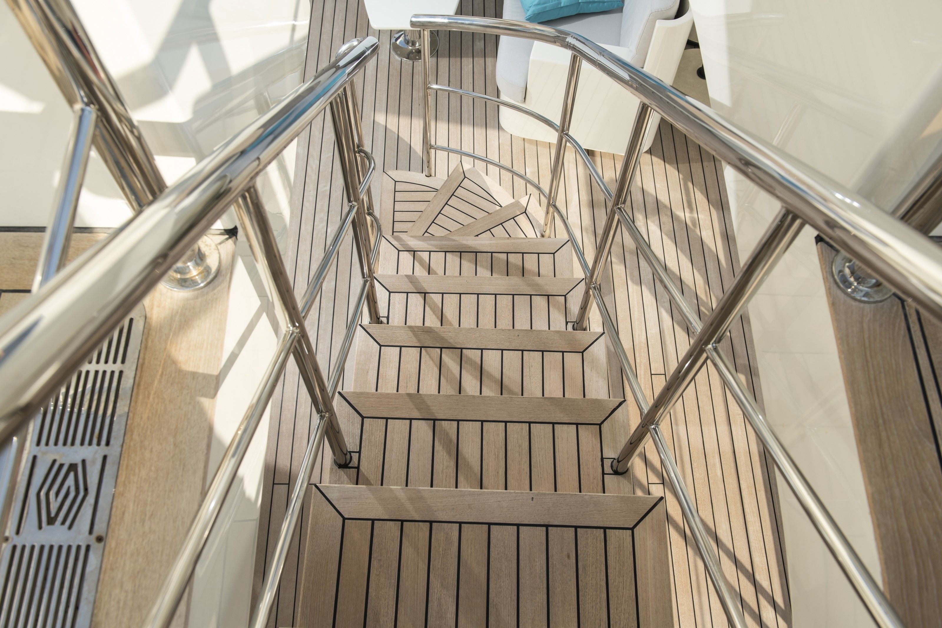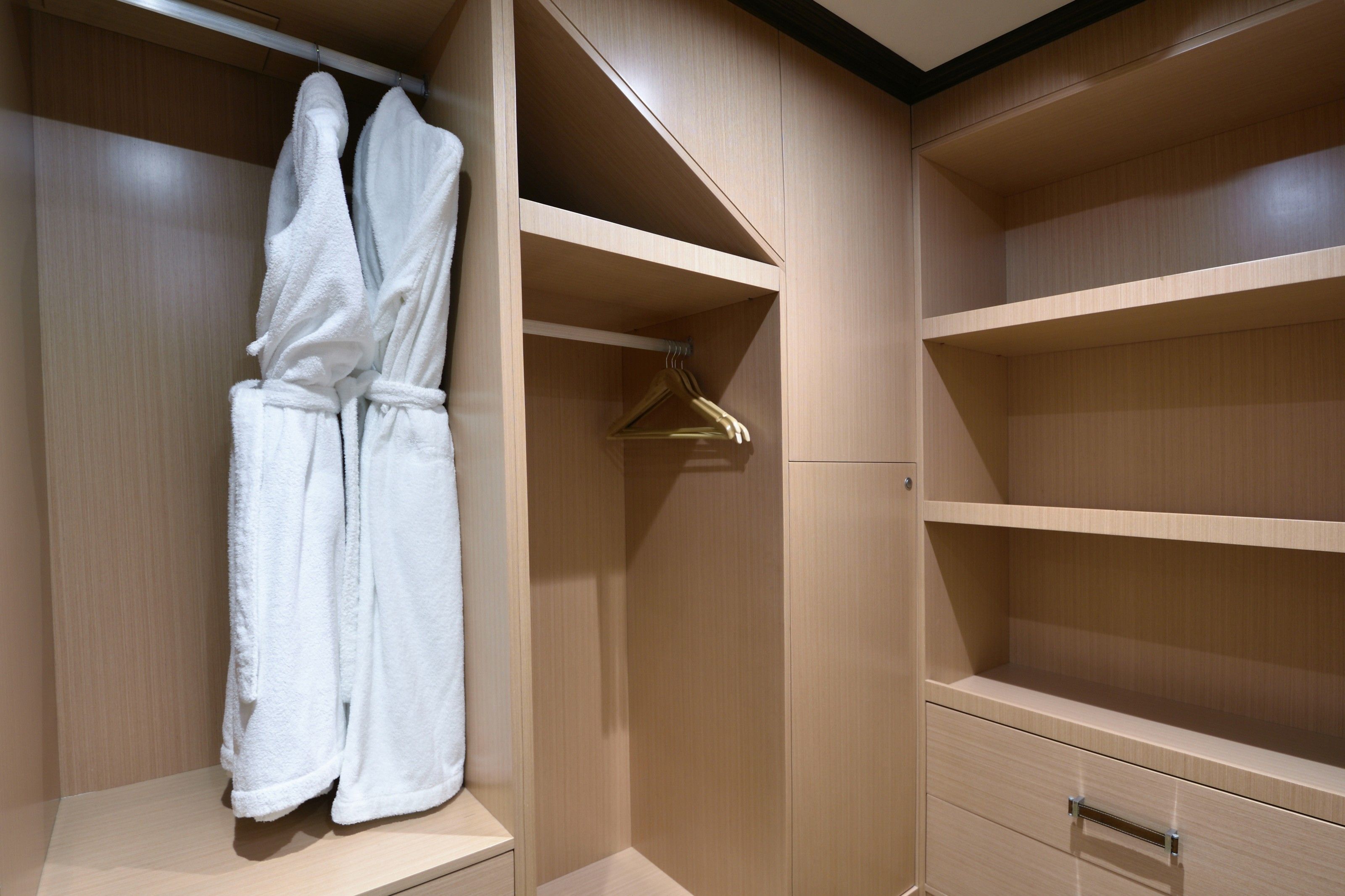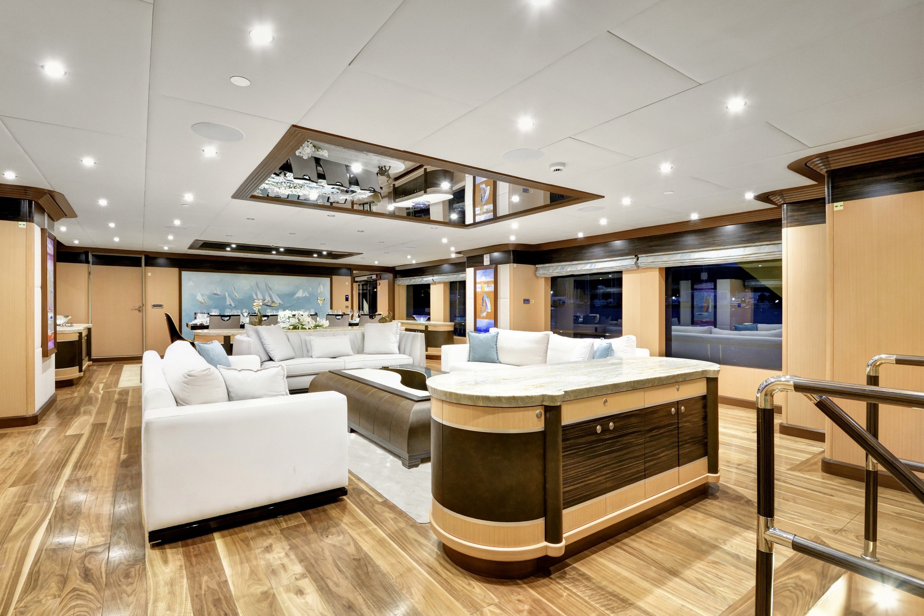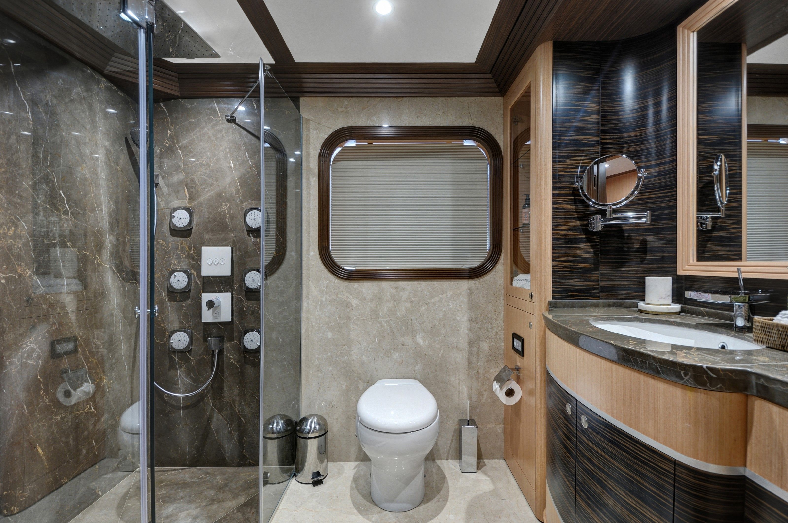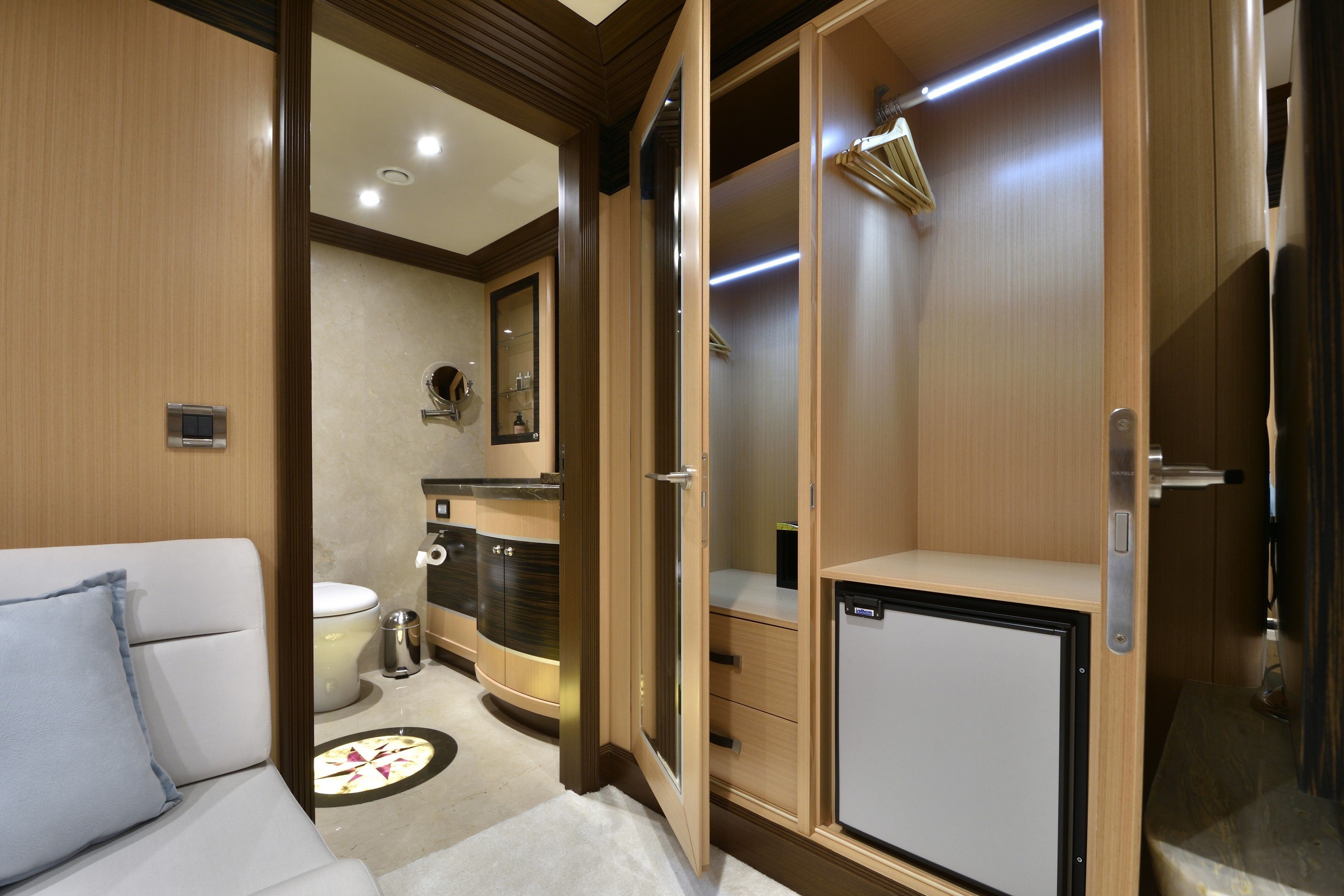 На основной палубе расположена просторная мастер-каюта с кроватью king-size с двумя санузлами и двумя гардеробными. На нижней палубе расположены 3 каюты с двуспальными кроватями и 2 каюты по 2 односпальные кровати в каждой. Все каюты оборудованы собственными санузлами.