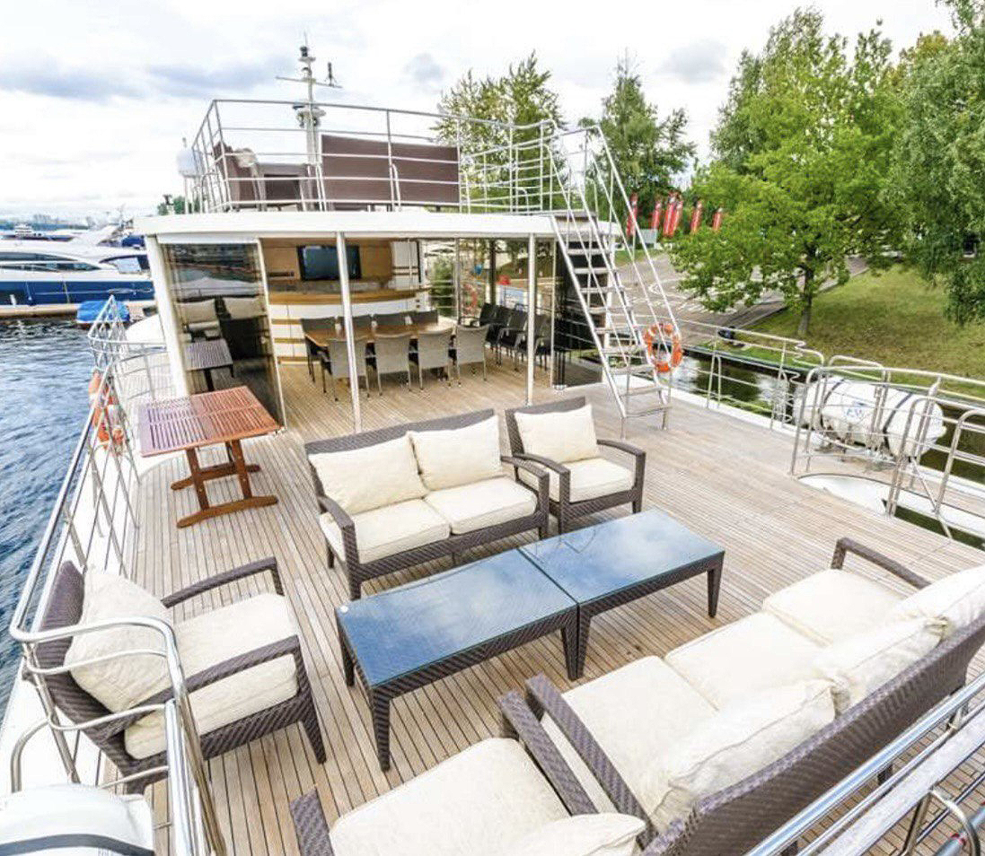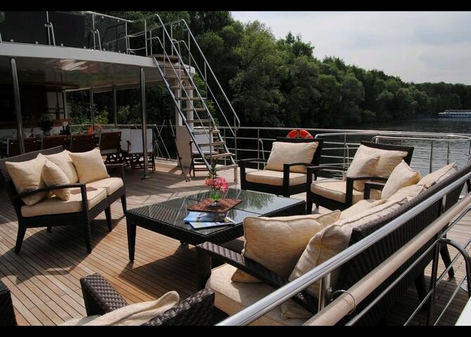 Приглашаем Вас отдохнуть на борту моторной яхты, напоминающей внешним видом колесный пароход. Оригинальная дизайнерская находка, совместившая внешний вид классического колесного парохода XIX века и современный интерьер в единой цветовой гамме благородных оттенков кофе с молоком.