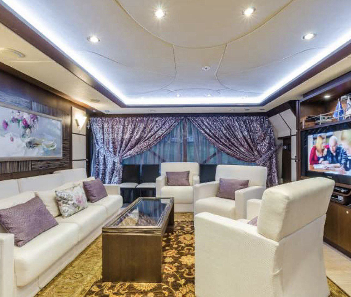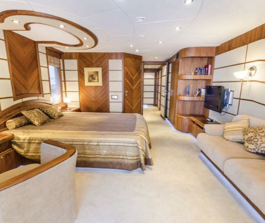 На время длительных путешествий на борту могут разместиться 8 гостей в 4х комфортабельных каютах с эксклюзивными дизайнерскими интерьерами и мебелью, созданной на заказ по индивидуальным эскизам.