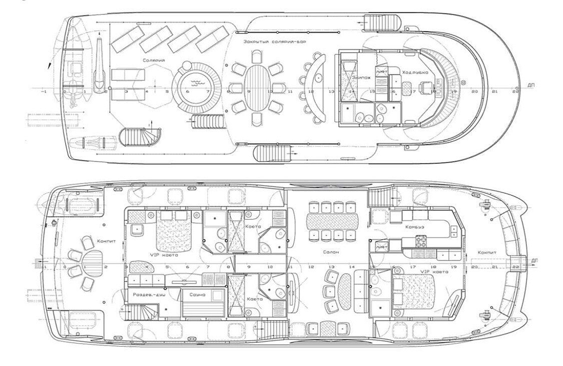 Многоярусная планировка яхты позволет найти себе место по душе. На главной палубе расположен салон, разделенный на 2 зоны: столовую и гостиную. Панорамное остекление позволяет любоваться пейзажами в любую погоду. В носовой части расположился камбус с самым современным оборудованием. На верхней палубе расположилась лаунж-зона с баром - идеальное место для релакса.
