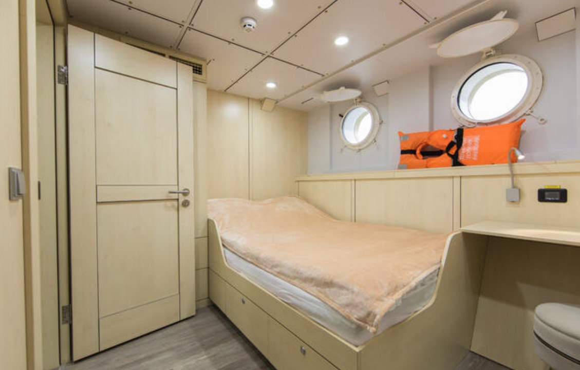- 2 мастер-каюты на первой палубе с панорамным остеклением в пол (по необходимости окна закрываются ролл-шторами), собственными санузлами, большими двуспальными кроватями