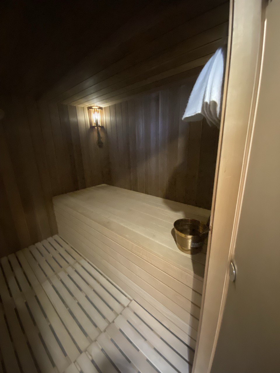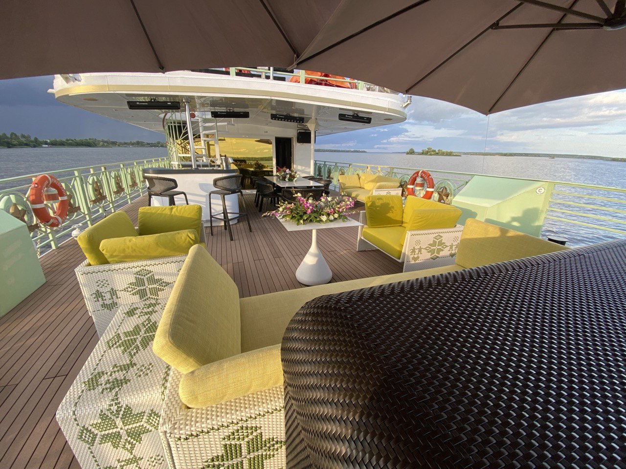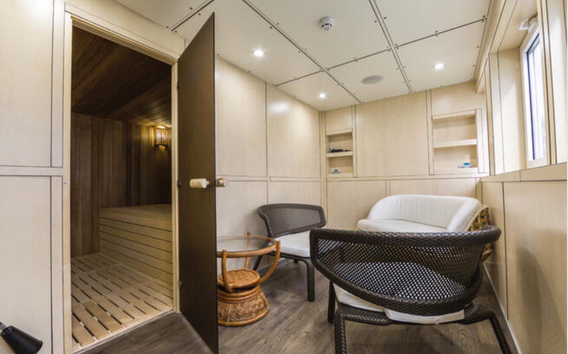- И наконец, особенность данного корабля: сауна, расположенная на второй палубе, (будем рады предложить веники разных видов), с уличным душем и еще одной зоной отдыха с диванами. Здесь можно расслабиться и сразу освежиться в речной воде с просторного кормового кринолина