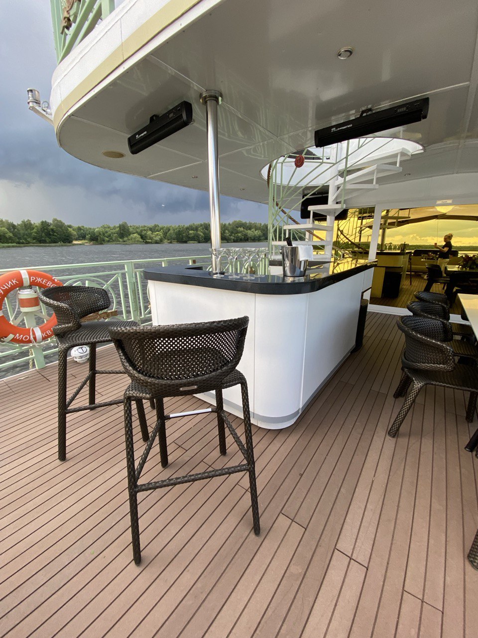 - Мягкий салон в носовой части теплохода с панорамным остеклением на 3 стороны и отделкой из натурального дерева темных оттенков. Салон оборудован кондиционером, плазменной панелью и музыкальной системой