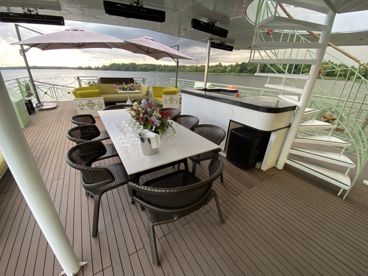 Двухпалубное прогулочное судно подойдет для празднования любого торжественного события в вашей жизни: свадьбы, дня рождения, юбилея, выпускного или просто романтической прогулки.