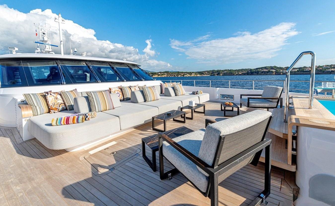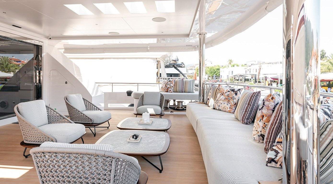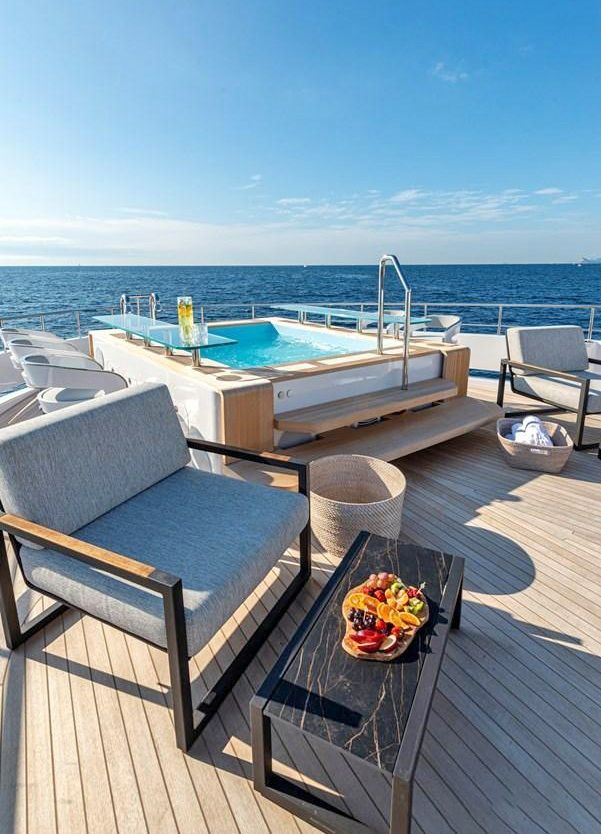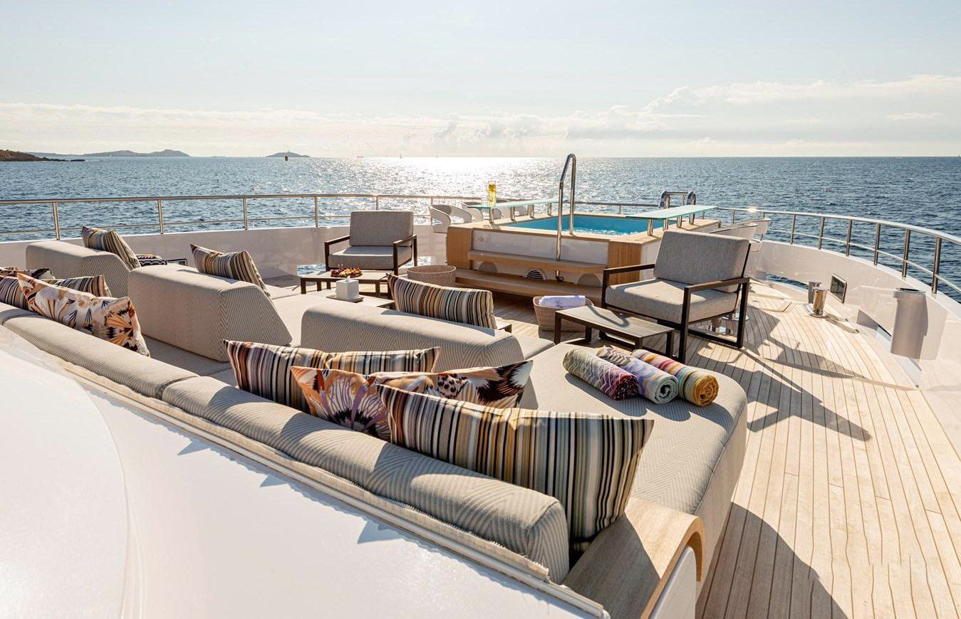 Эффектный салон на верхней палубе со стеклянной крышей и раздвижными дверями от пола до потолка создают ощущение открытого пространства. В кормовой части в зоне отдыха, между двух лежаков для загара, расположен спа-бассейн, а в тени навеса размещены 3 лежака для отдыха.