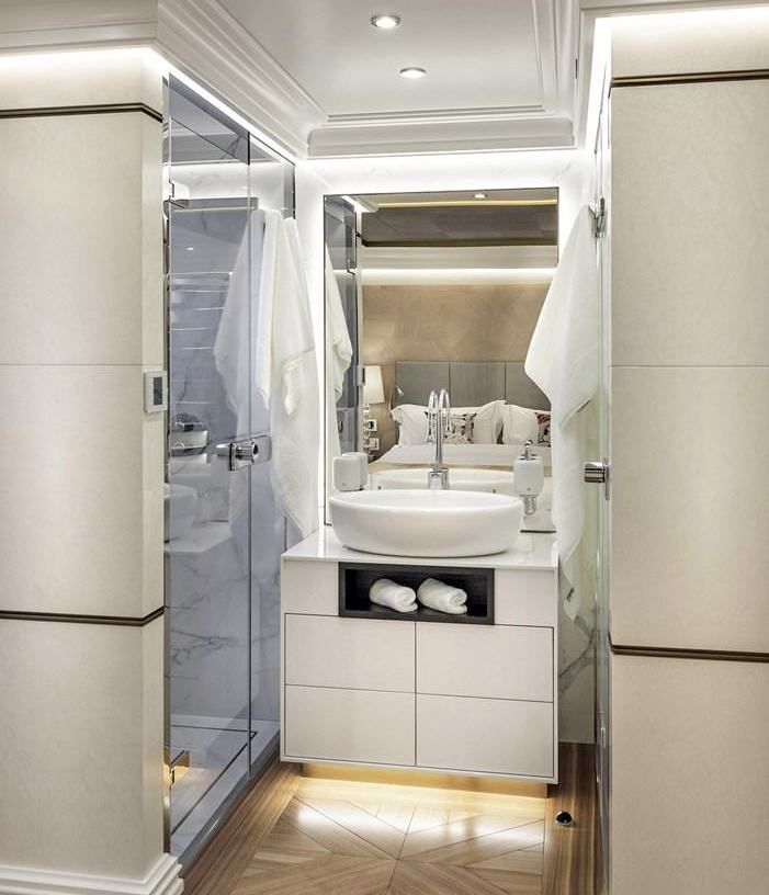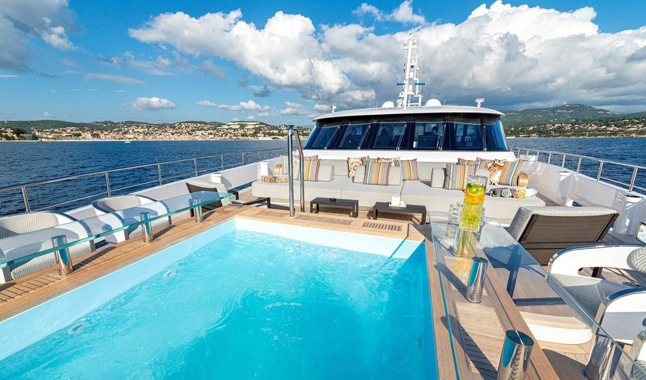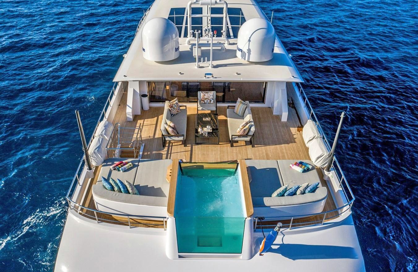 Эффектный салон на верхней палубе со стеклянной крышей и раздвижными дверями от пола до потолка создают ощущение открытого пространства. В кормовой части в зоне отдыха, между двух лежаков для загара, расположен спа-бассейн, а в тени навеса размещены 3 лежака для отдыха.