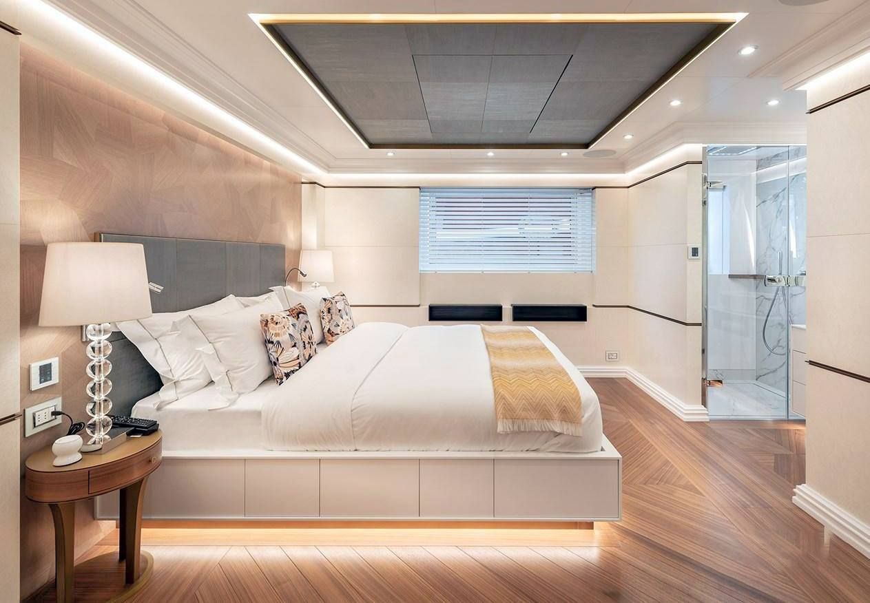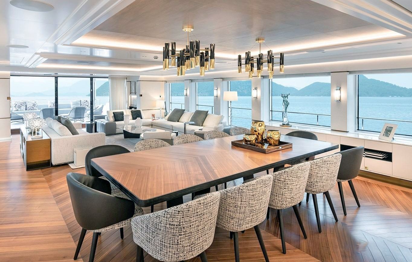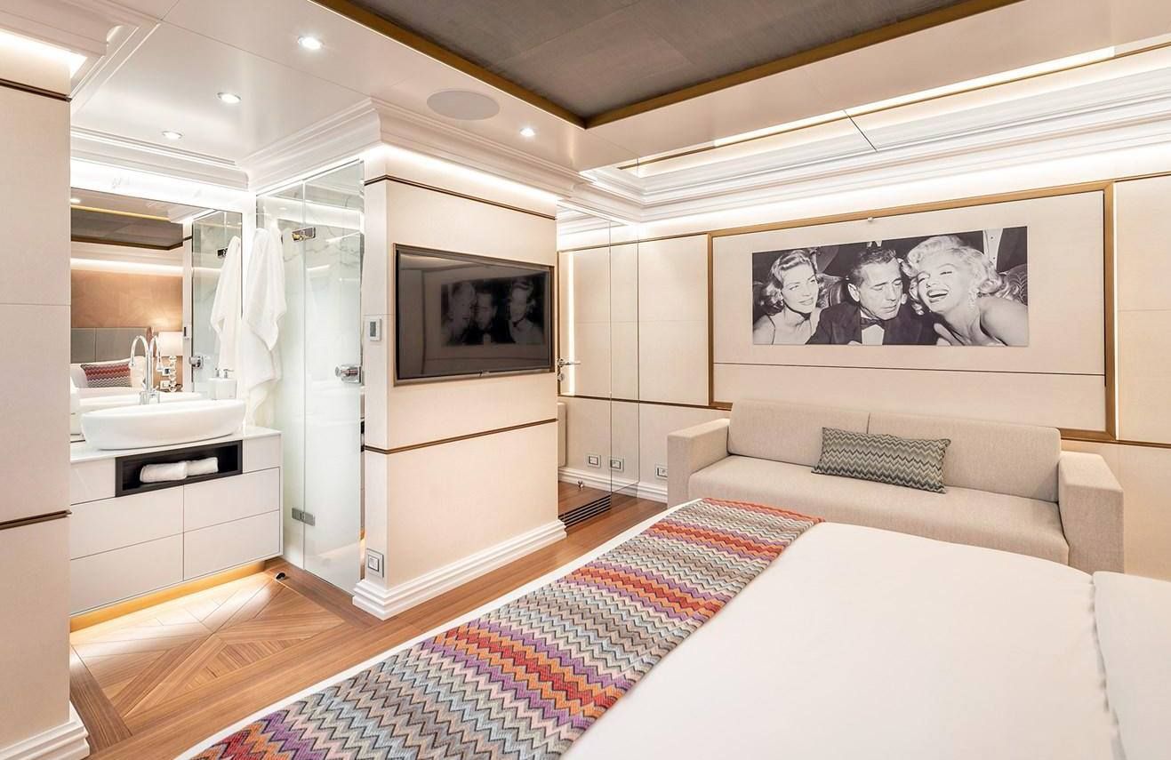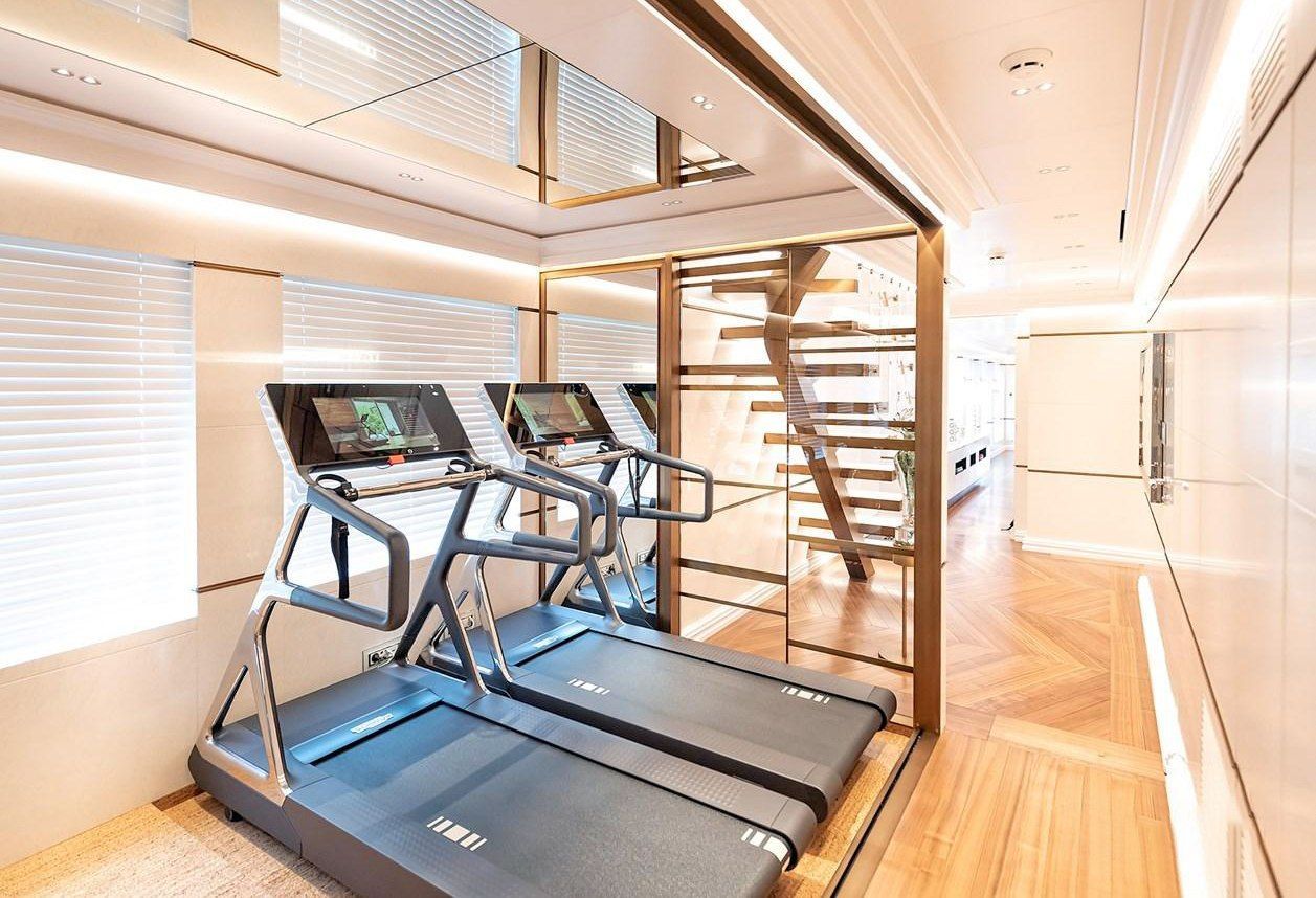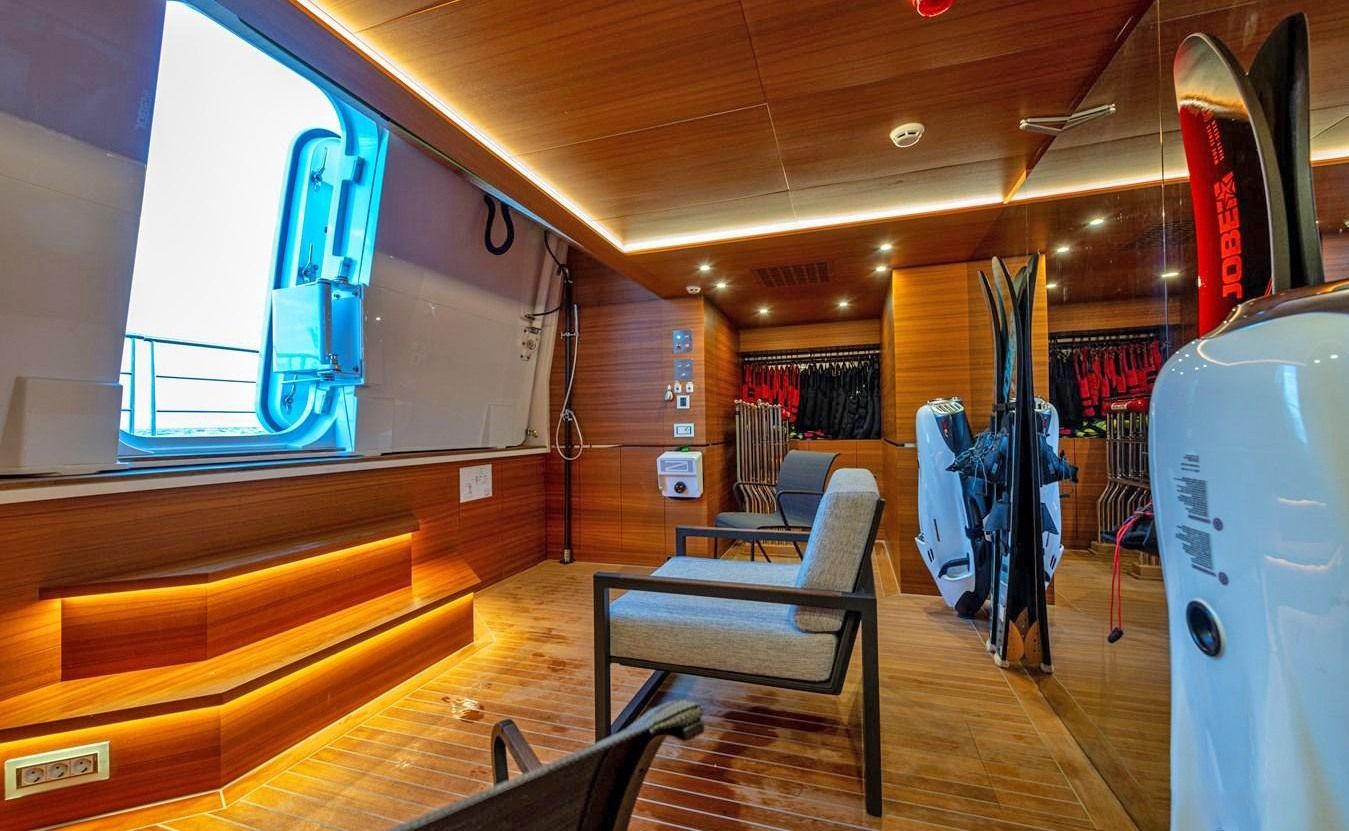 Кроме мастер-каюты на главной палубе расположен спортивный зал, камбуз и салон. В салоне оборудована обеденная зона со стильным обеденным столом, за которым может разметиться компания до 12 человек. В носовой части главной палубы расположен гараж для тендера с боковым люком для спуска и подъема тендера и водных игрушек. Здесь же расположена зона для загара с шезлогами и джакузи, куда можно попасть по лестнице с правого борта. А по двум лестницам в кормовой части можно спуститься на нижнюю палубу, гда расположен выход на купальную платформу.