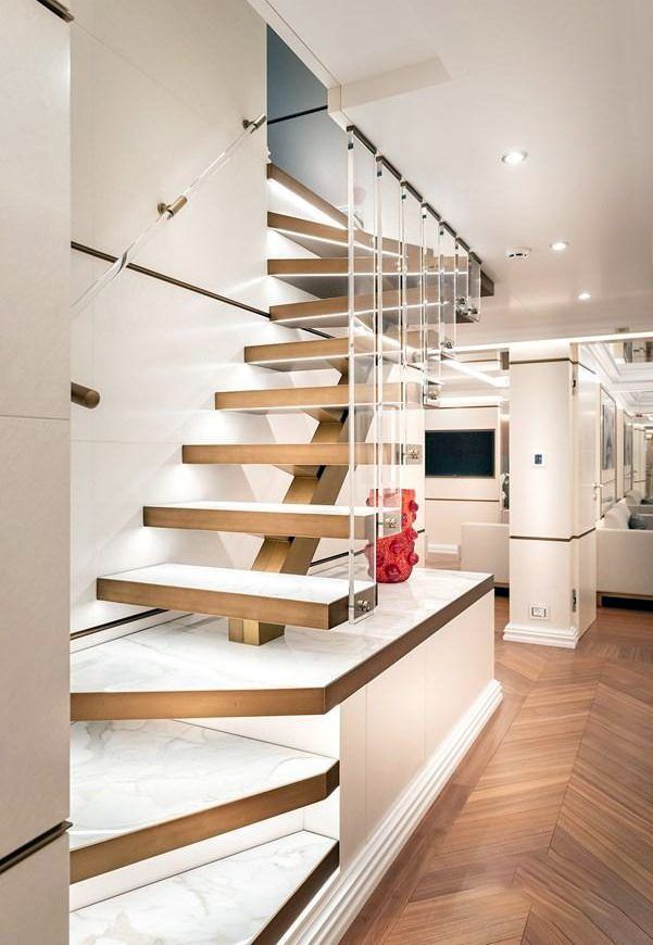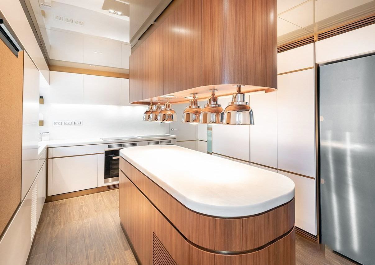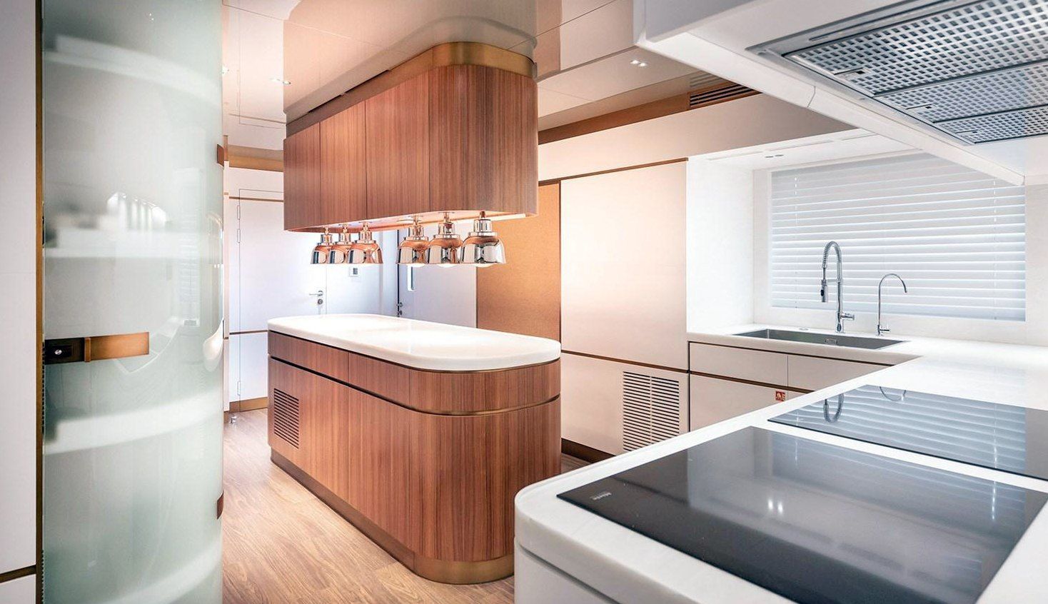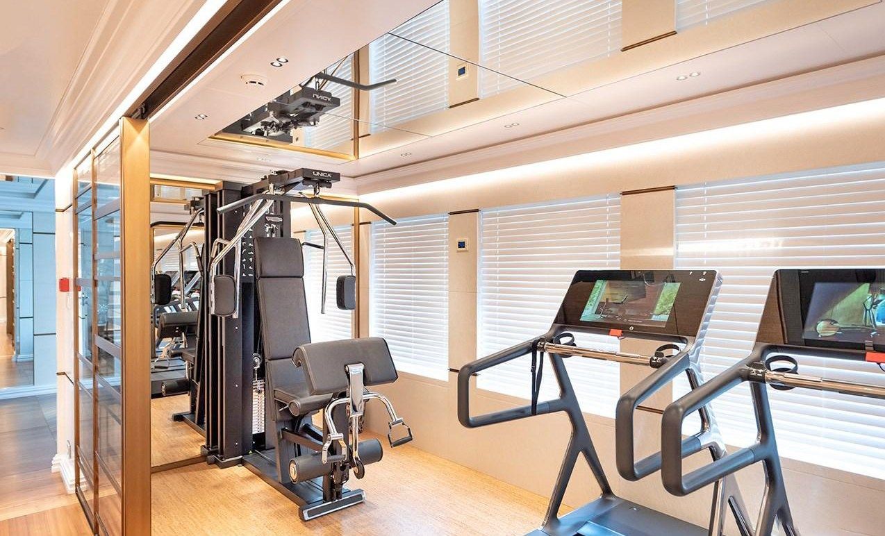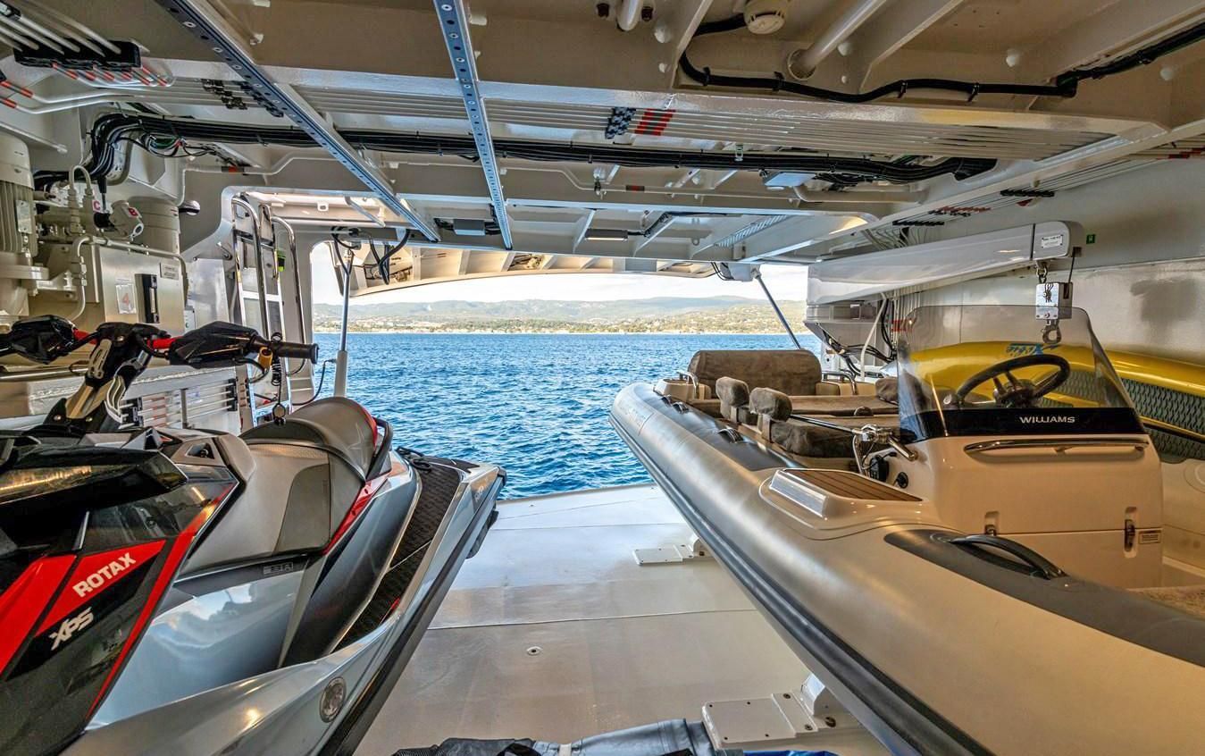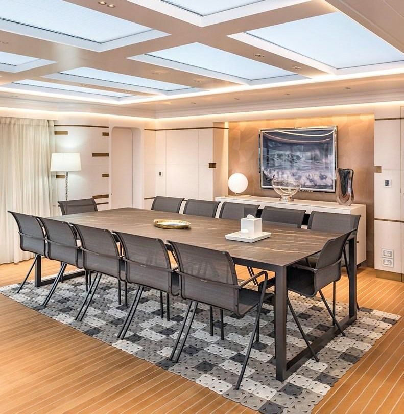 Кроме мастер-каюты на главной палубе расположен спортивный зал, камбуз и салон. В салоне оборудована обеденная зона со стильным обеденным столом, за которым может разметиться компания до 12 человек. В носовой части главной палубы расположен гараж для тендера с боковым люком для спуска и подъема тендера и водных игрушек. Здесь же расположена зона для загара с шезлогами и джакузи, куда можно попасть по лестнице с правого борта. А по двум лестницам в кормовой части можно спуститься на нижнюю палубу, гда расположен выход на купальную платформу.