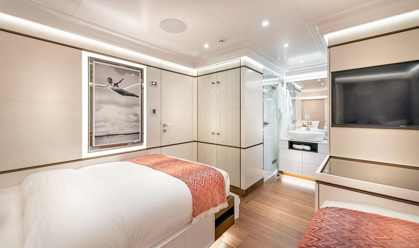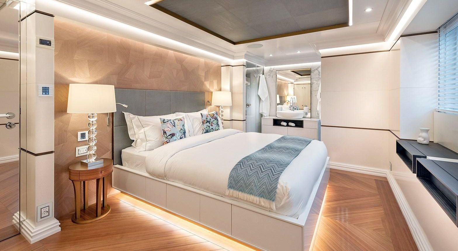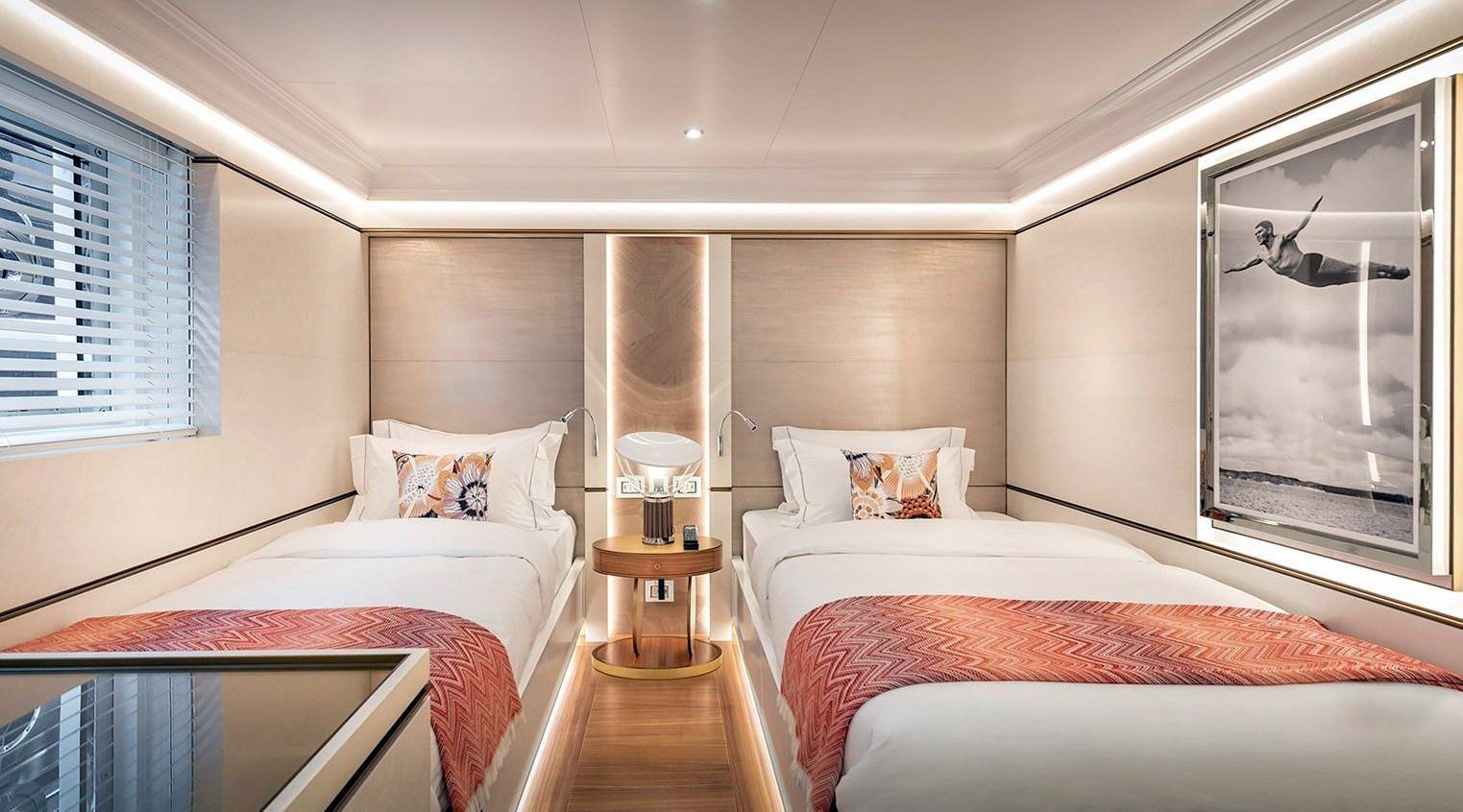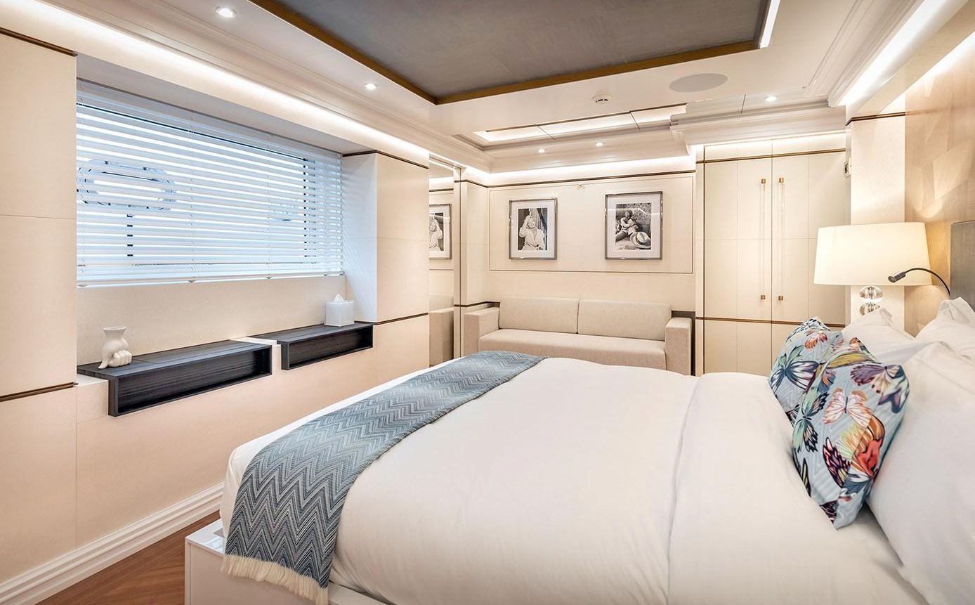 Для размещения гостей на борту предназначены 6 комфортабельных кают: мастер-каюта на главной палубе; 3 каюты с двуспальными кроватями и 2 каюты с двумя односпальными кроватями в каждой на нижней палубе. Во всех каютах доступны системы развлечений, телевизоры и отдельные санузлы с душевыми кабинами.