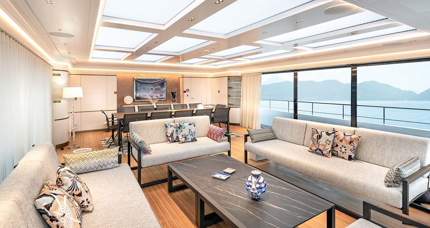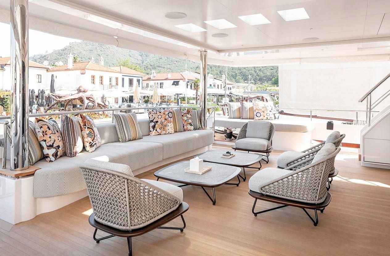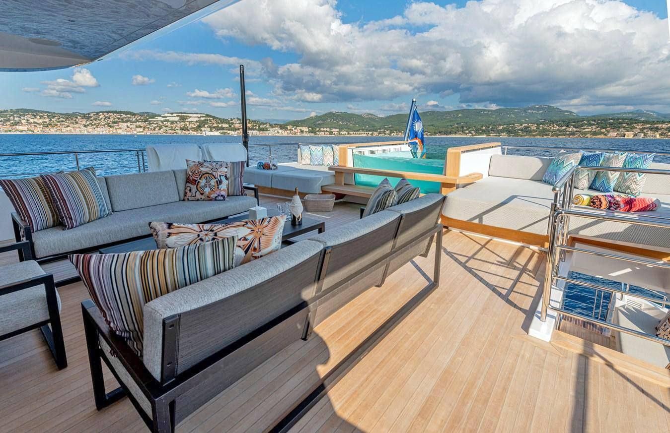 Кормовая часть главной палубы является открытым продолжением салона. Здесь расположен большой диван и несколько кресел вокруг кофейного столика - идеальное место для утреннего кофе или вечерних посиделок под открытым небом. В салоне расположено множество диванов и кресел вокруг журнального столика, где, устав от летнего зноя, можно отдохнуть в прохладе за просмотром телевизора.