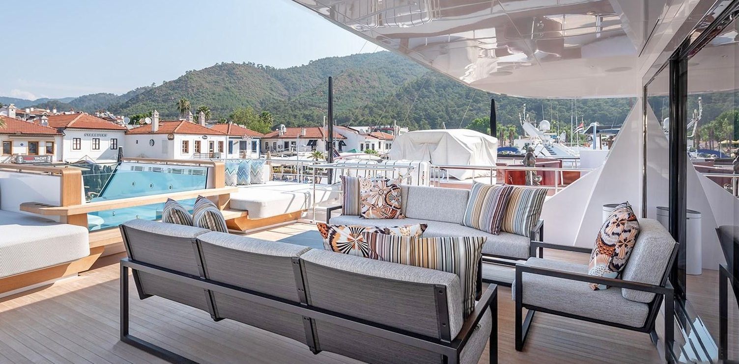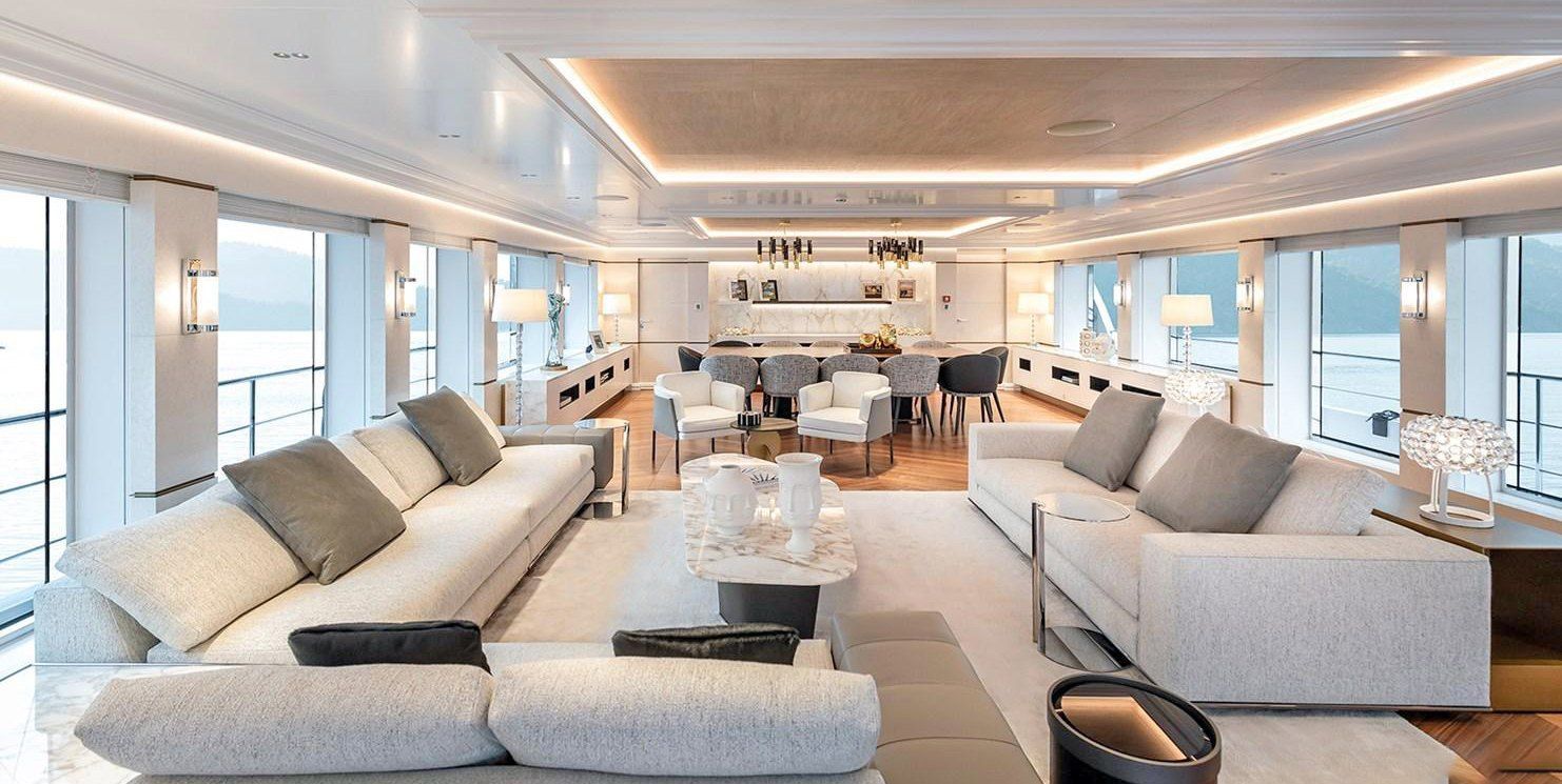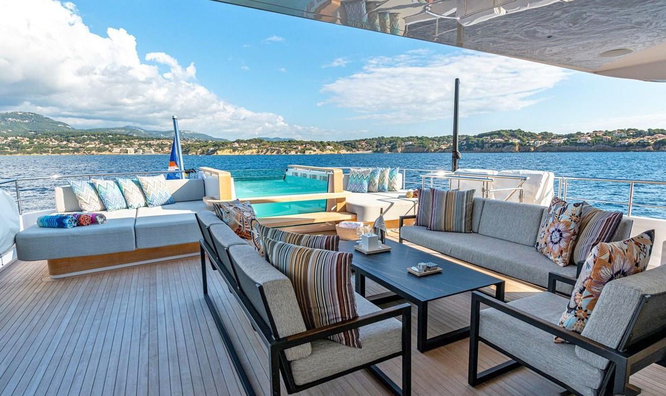 Кормовая часть главной палубы является открытым продолжением салона. Здесь расположен большой диван и несколько кресел вокруг кофейного столика - идеальное место для утреннего кофе или вечерних посиделок под открытым небом. В салоне расположено множество диванов и кресел вокруг журнального столика, где, устав от летнего зноя, можно отдохнуть в прохладе за просмотром телевизора.