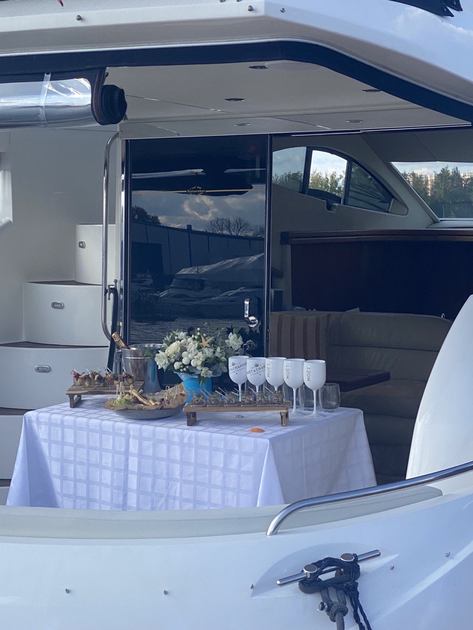 Если вы планируете провести на борту моторной яхты день рождения, свадебную фотосессию или романтическую прогулку, компания Rest Mar поможет в украшении судна шарами и цветочными композициями.